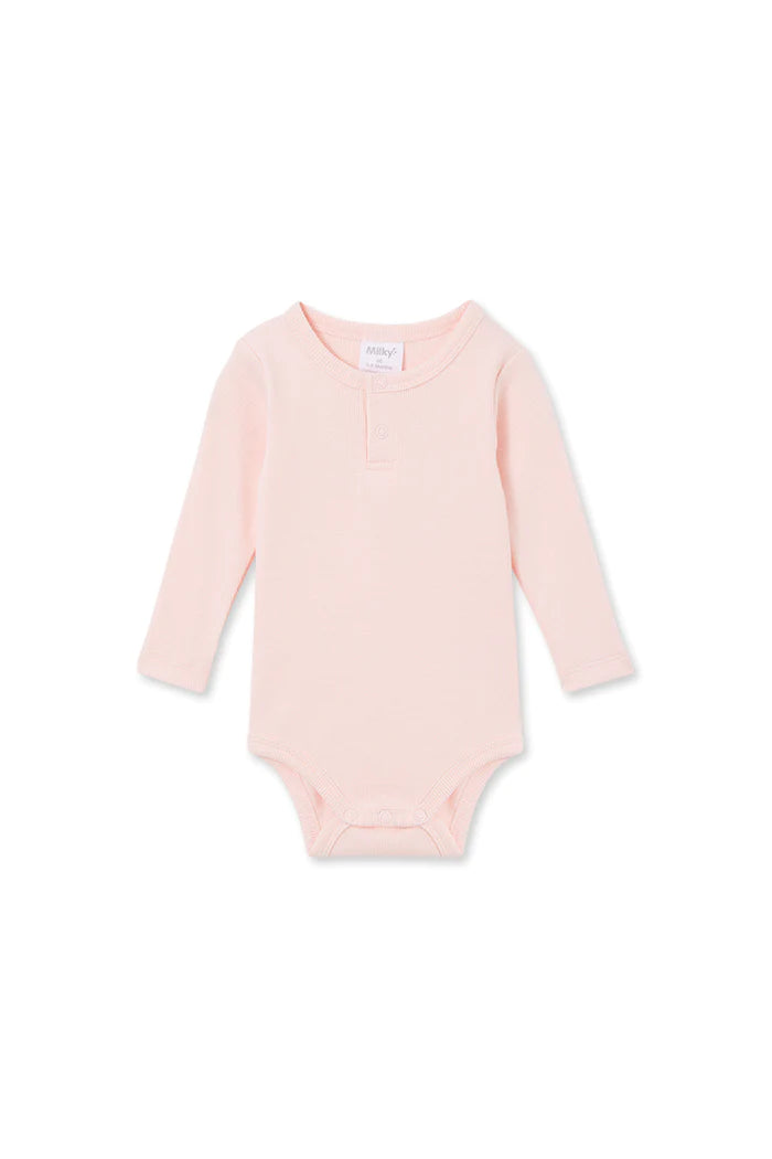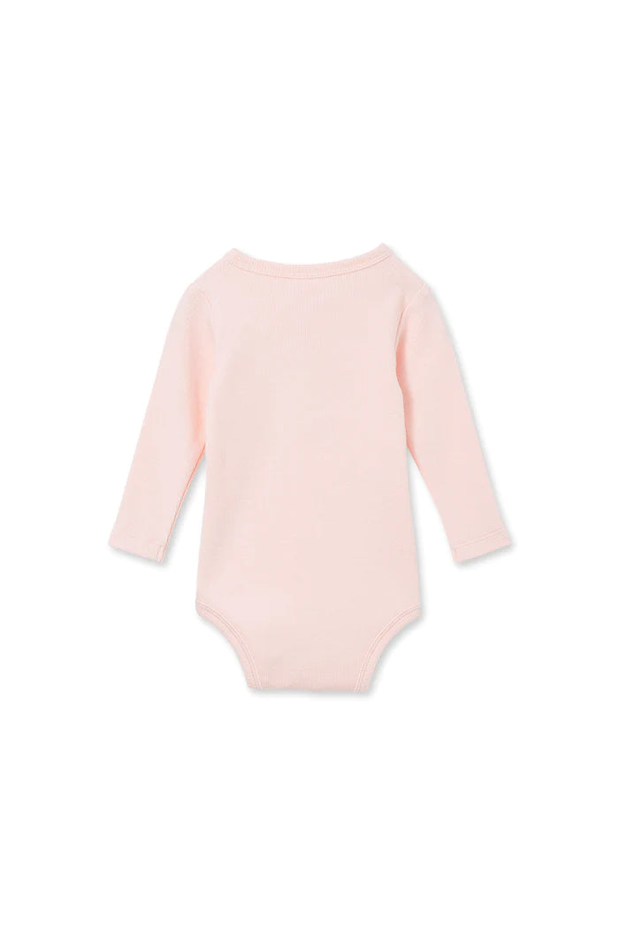 Milky Clothing Powder Pink Rib Bubbysuit. Our Milky long-sleeved rib bubbysuits are the perfect staple for your little one’s wardrobe. This girl's bubbysuit can be worn all year round. Wear this bubbysuit alone or pair it with bottoms.