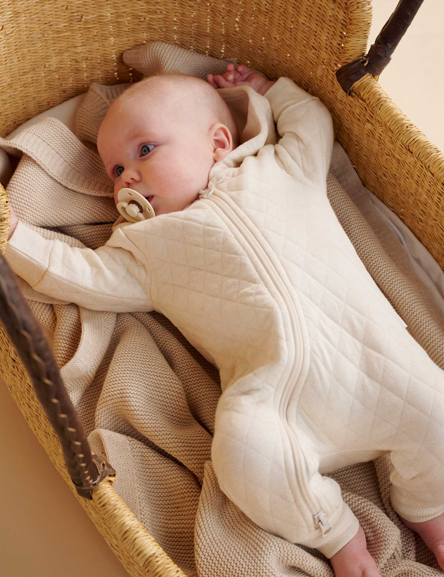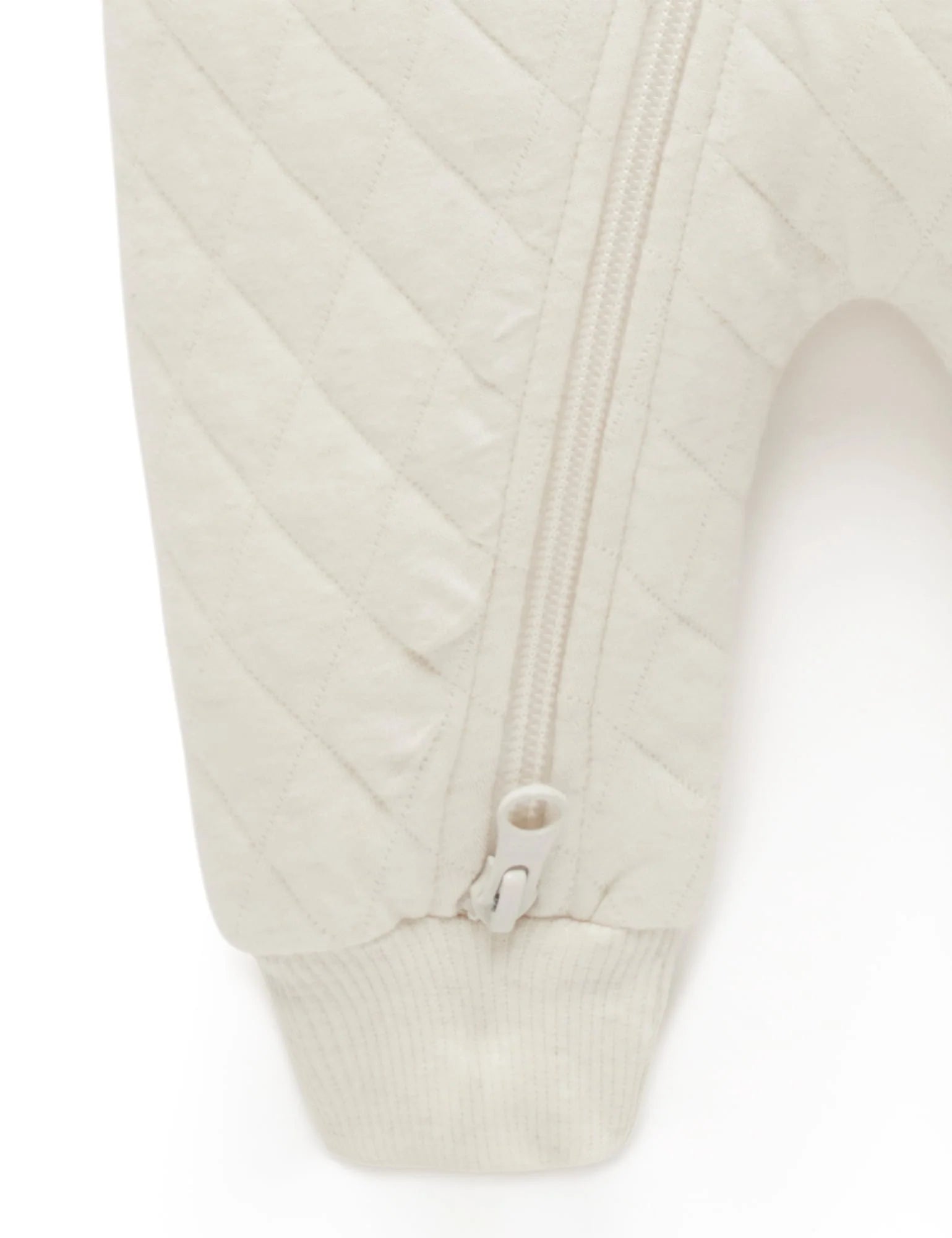 Keep your little one super cosy and covered in our Essentials Quilted Growsuit. Keep the chill out with an inbuilt hood and ribbed cuffs to stop the legs or arms riding up. Featuring a two way zip at the front for easy dressing.