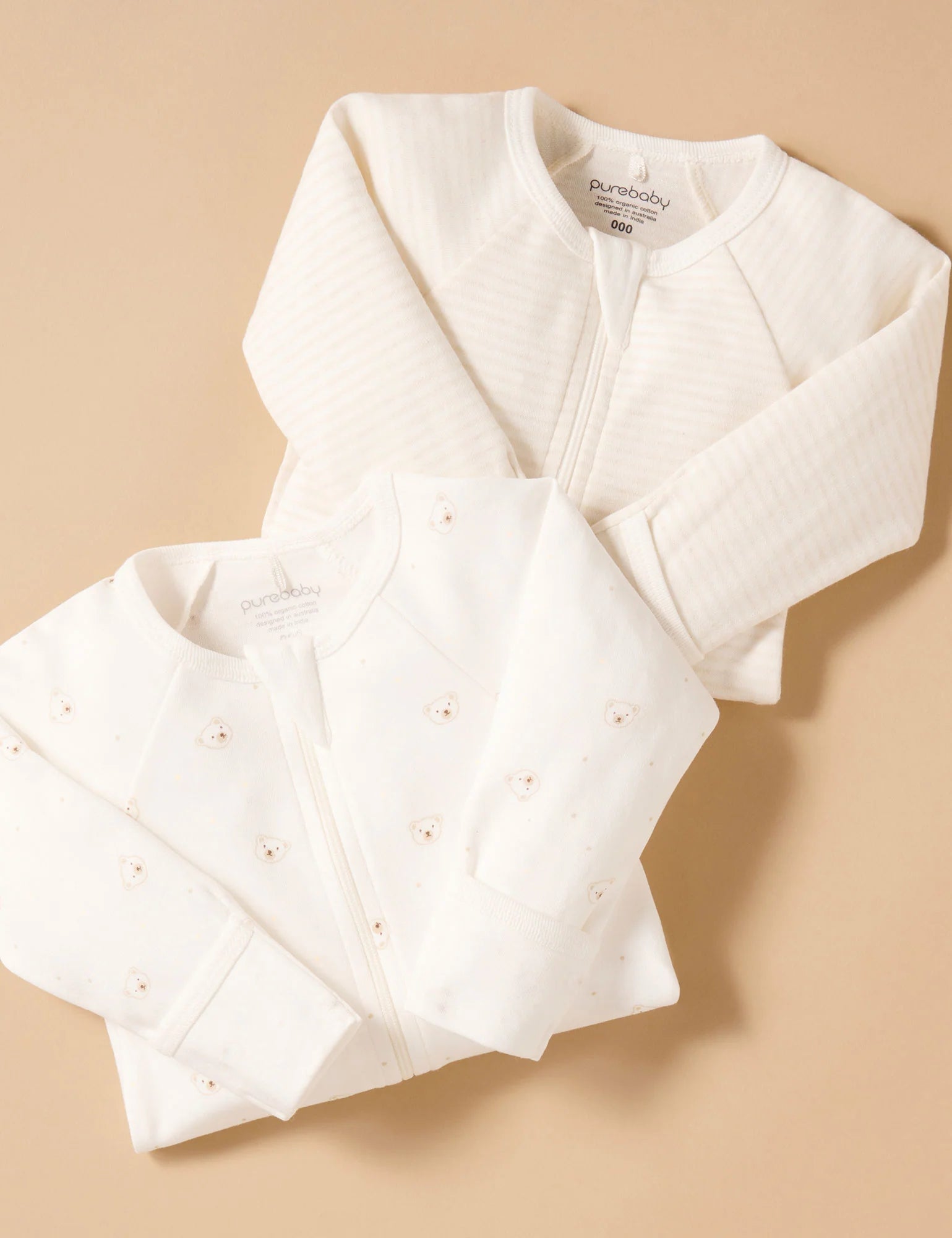 Our two pack Essentials Zip Growsuit designed for practicality and comfort. Featuring a full length double zip for the easiest of dressing. With long sleeves, inbuilt feet and optional turn-over mittens in sizes 0000-000, your newborn will be kept covered and warm. Made from the softest certified 100% Organic Cotton for a soft and gentle touch against your baby's delicate skin.