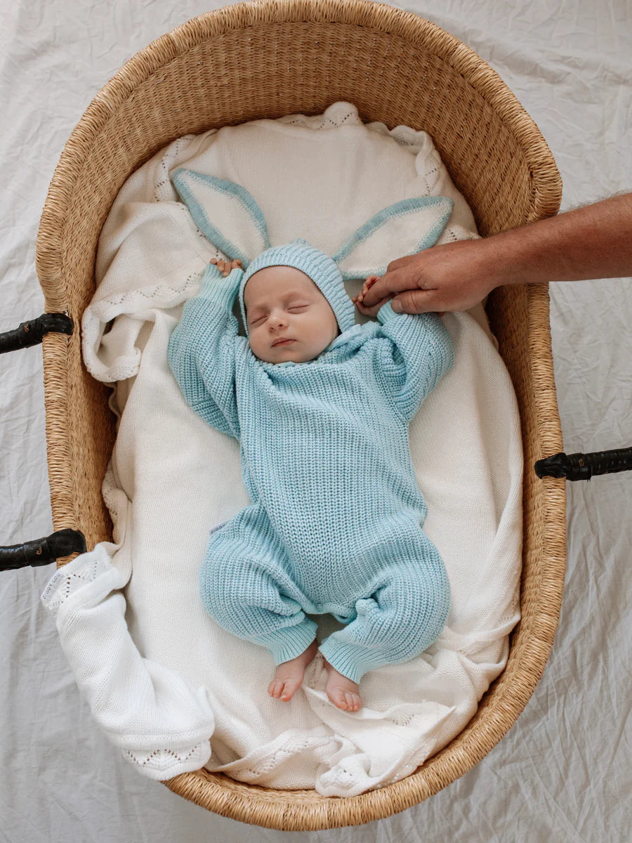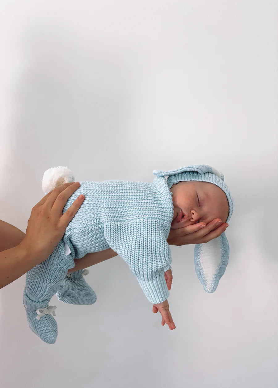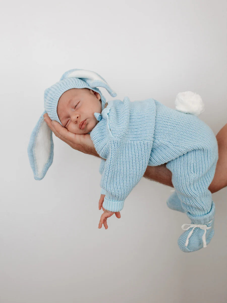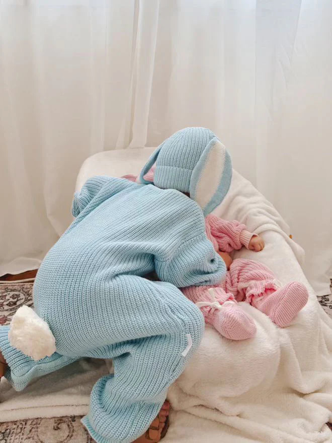 Our Easter winter playsuit in our two tone Echo colour features an adorable and removable bunny tail (press snap) Functional snaps at crotch for easy nappy changes, and snaps at shoulder for easy on/off. Matching Echo Easter Beanie and Booties also available.