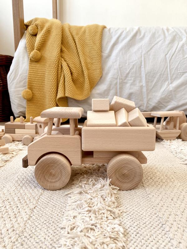 Darby has a tray full of cargo and he's ready to play! Toy trucks are always a popular choice with young children so it's always extra special when they have a surprise on board. These beautifully handcrafted wooden trucks come with their own set of wooden blocks that fit snuggly into the cargo tray. Children will have hours of creative fun building, moving, loading and stacking with these amazing toys. A must have for any playroom.