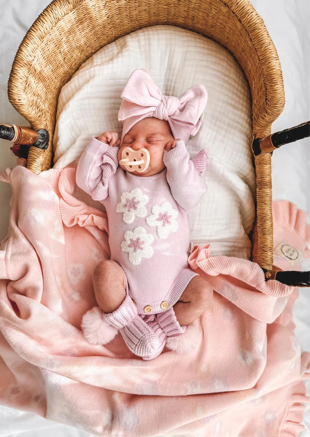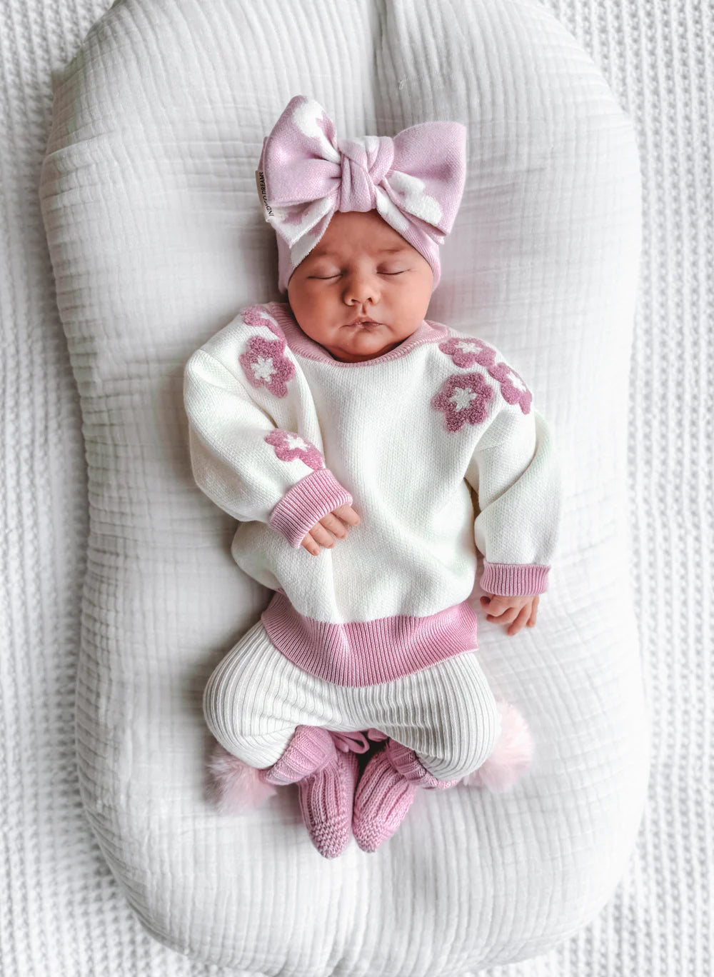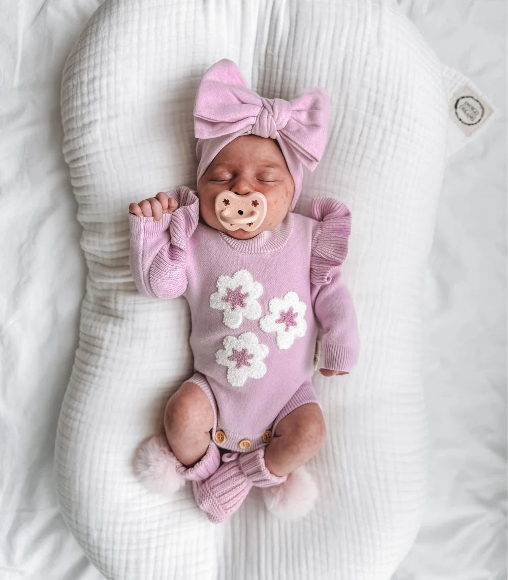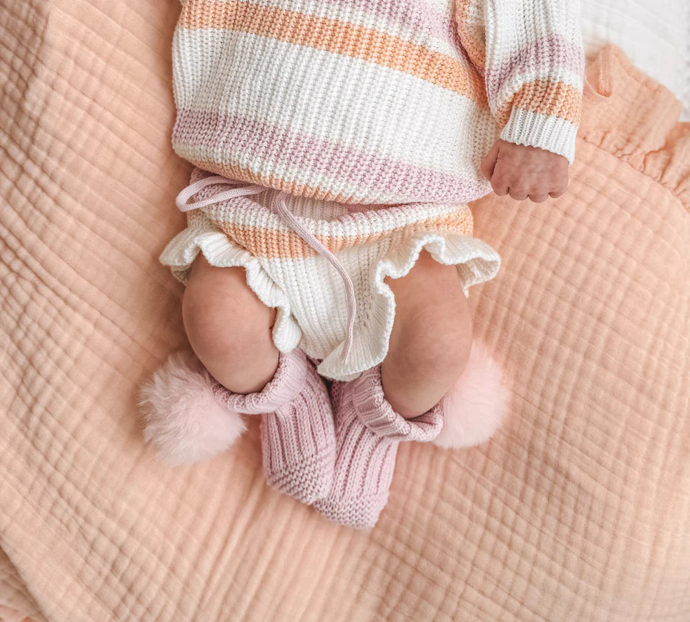 Our knit pom pom booties are the perfect little accessory to keep your little ones feet warm. They're made from 100% cotton, featuring a removable pom pom on the side and a tie at the back to secure them.