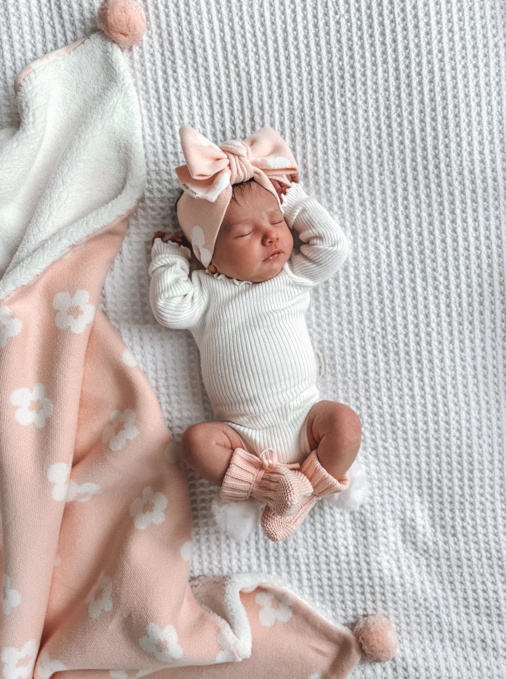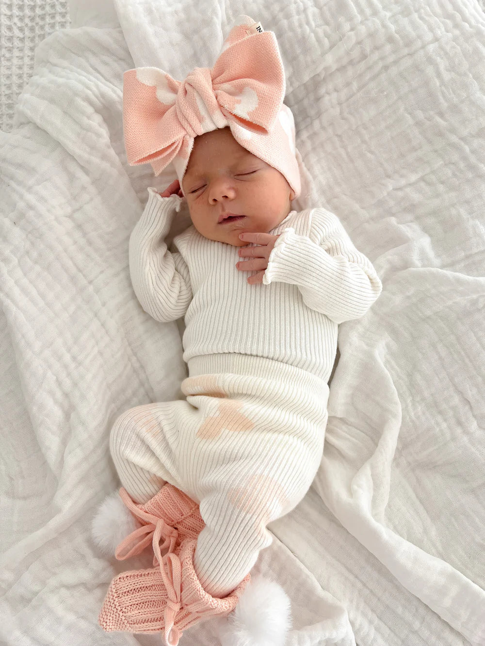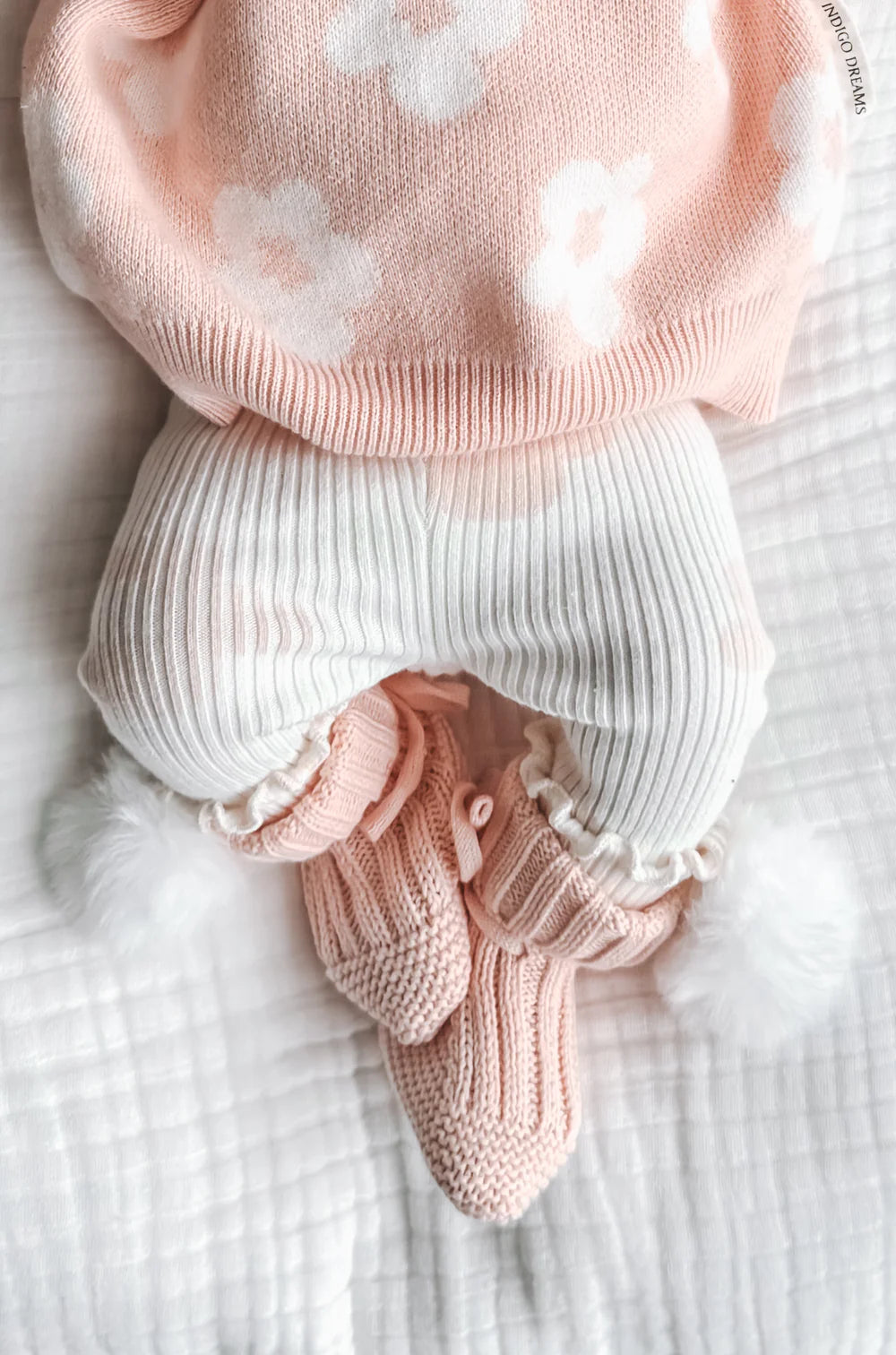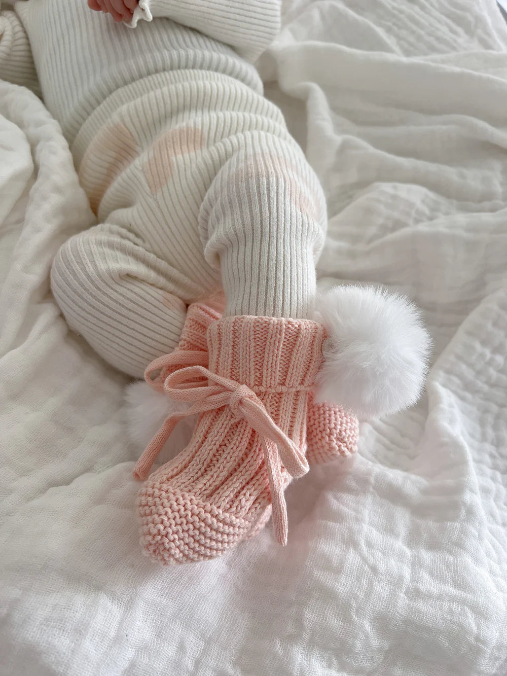 Our knit pom pom booties are the perfect little accessory to keep your little ones feet warm. They're made from 100% cotton, featuring a removable pom pom on the side and a tie at the back to secure them.
