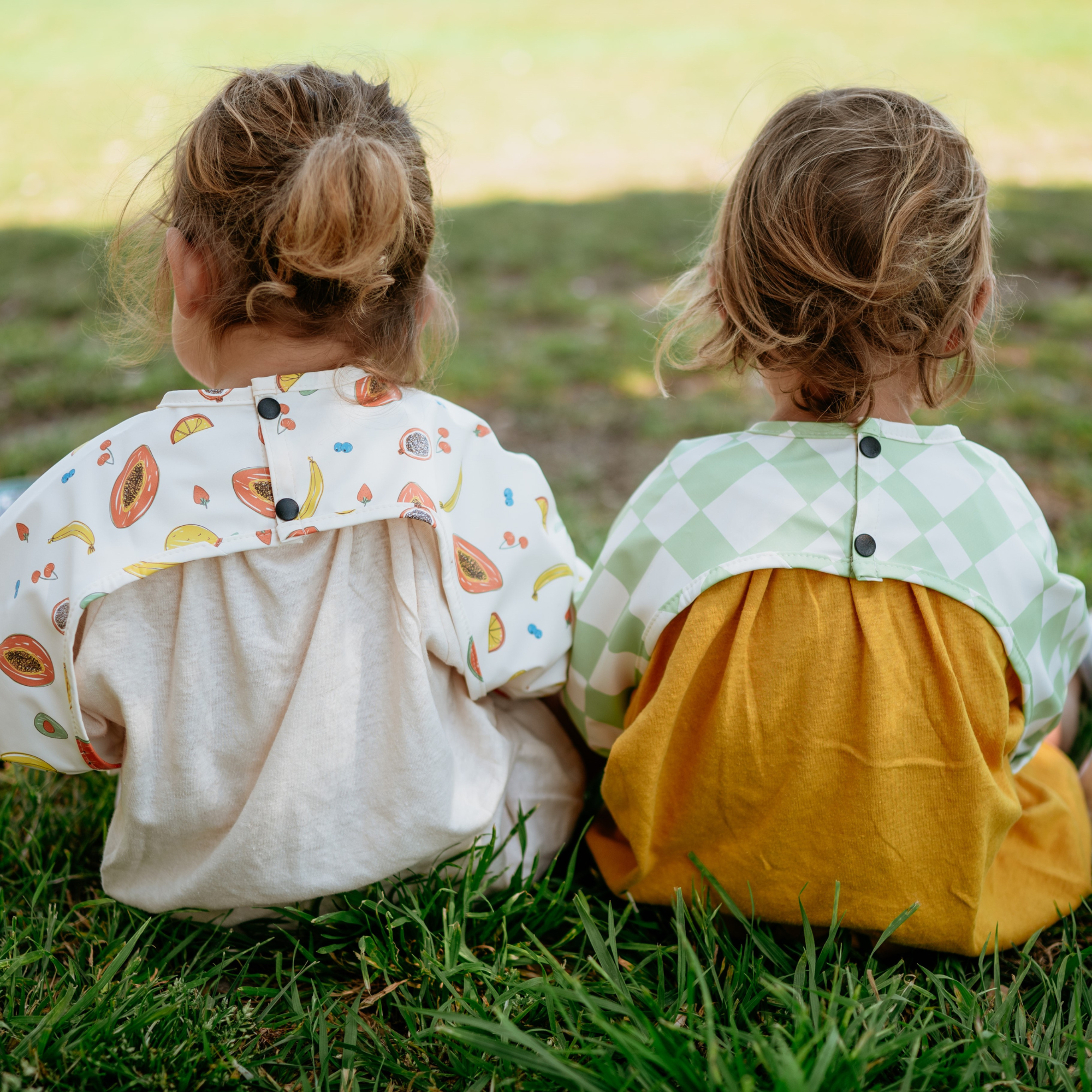 Our bib has been crafted to address the needs of the messiest eaters! This colorful bib with long sleeves provides more coverage than traditional bibs. The elastics prevent food spillage into the sleeves, while a pocket catches all those inevitable crumbs, sparing your floor from the aftermath. Suitable for children aged approximately 6 months - 3 years old, quick to place around your child's neck and fasten using the snap button and just as quick to remove. Elevate your child's dining and creative experiences with our joyful bibs !