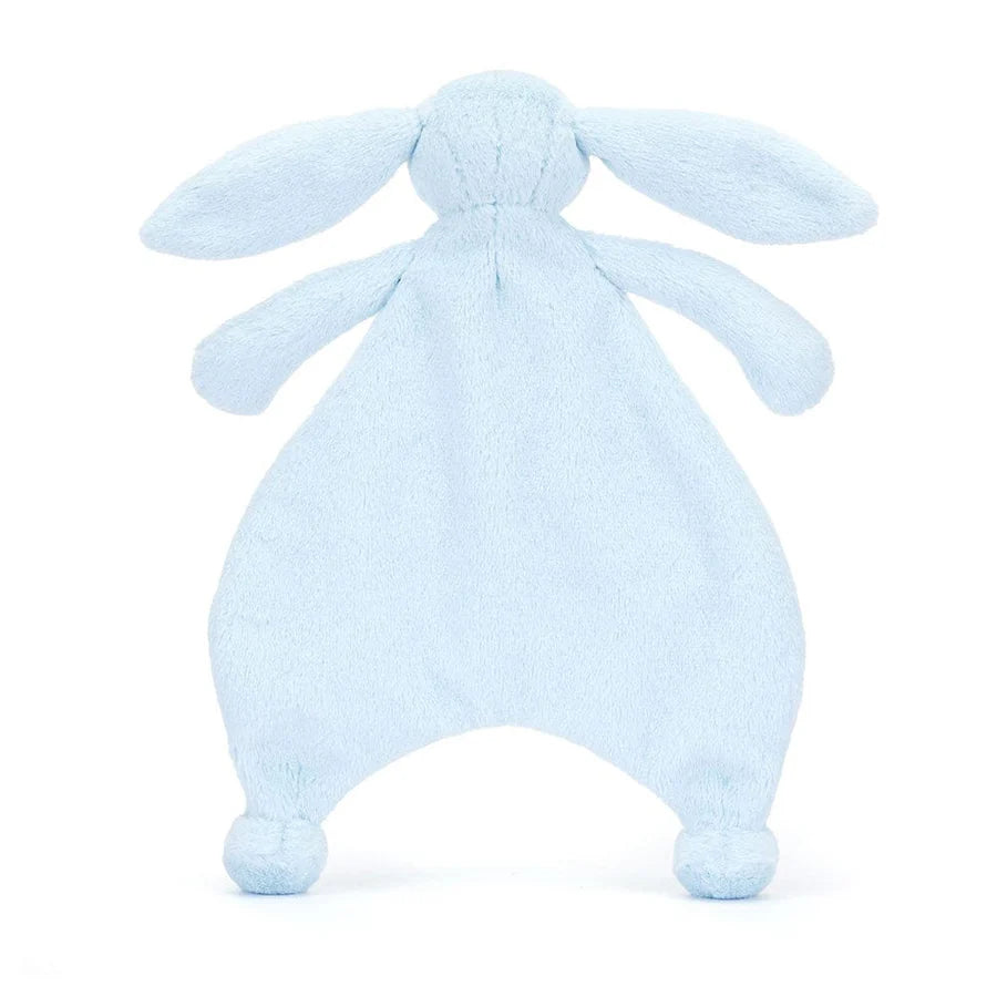 Irresistibly soft in a blue coloured fur made from recycled fibres, Bashful Blue Bunny Comforter features our beloved Bashful Bunny signature long lop ears, a blue suedette nose and embroidered eyes. Designed with an un-stuffed body yet delicately squashy paws and bobble feet, making it easy for little hands to grab hold of and comfort themselves.
