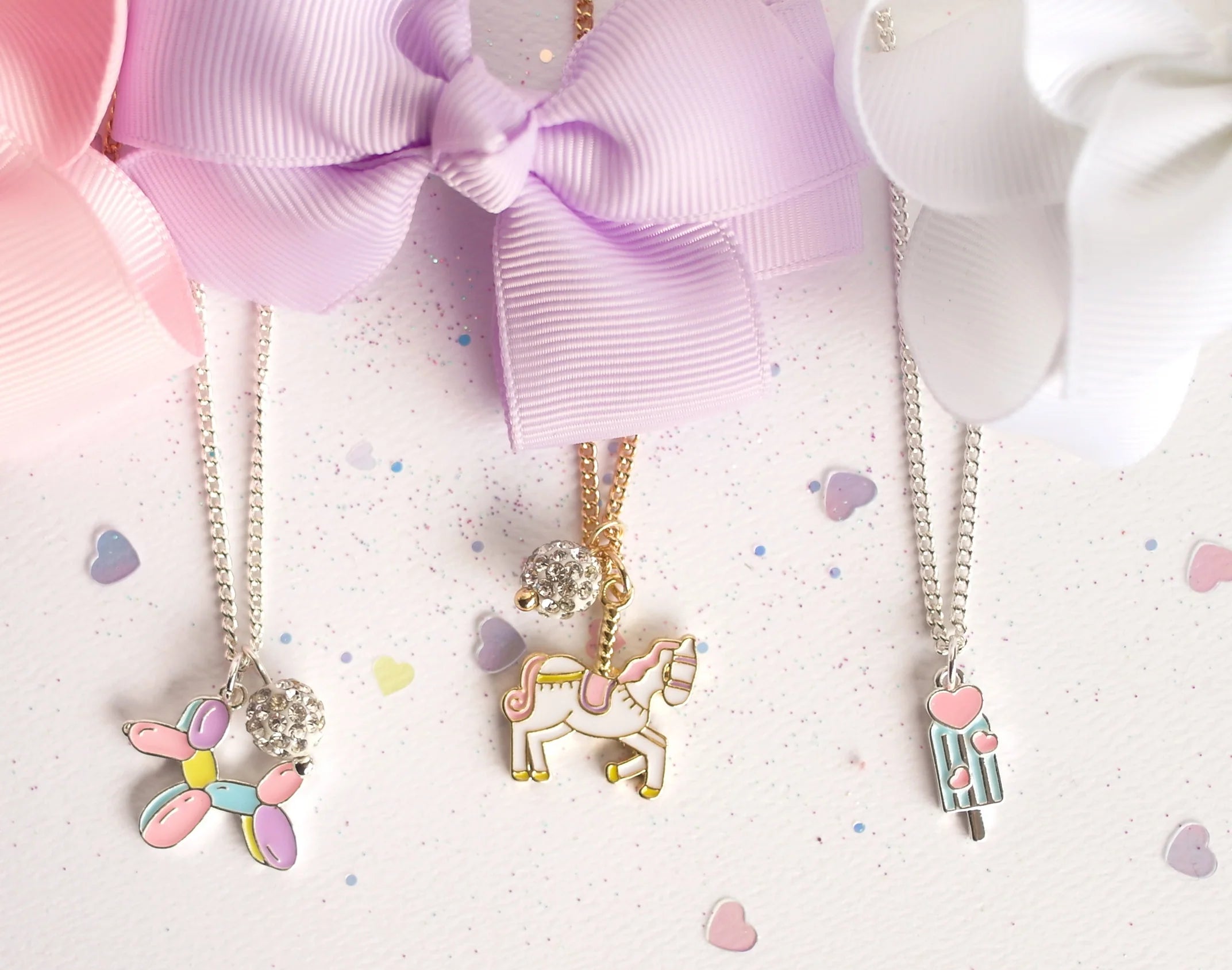 The necklace features a pastel balloon dog with a diamond ball. The perfect necklace to add a playful, yet elegant touch to a party outfit or everday outfit. The coolest perfect gift idea for that special someone. Perfect for tweens.