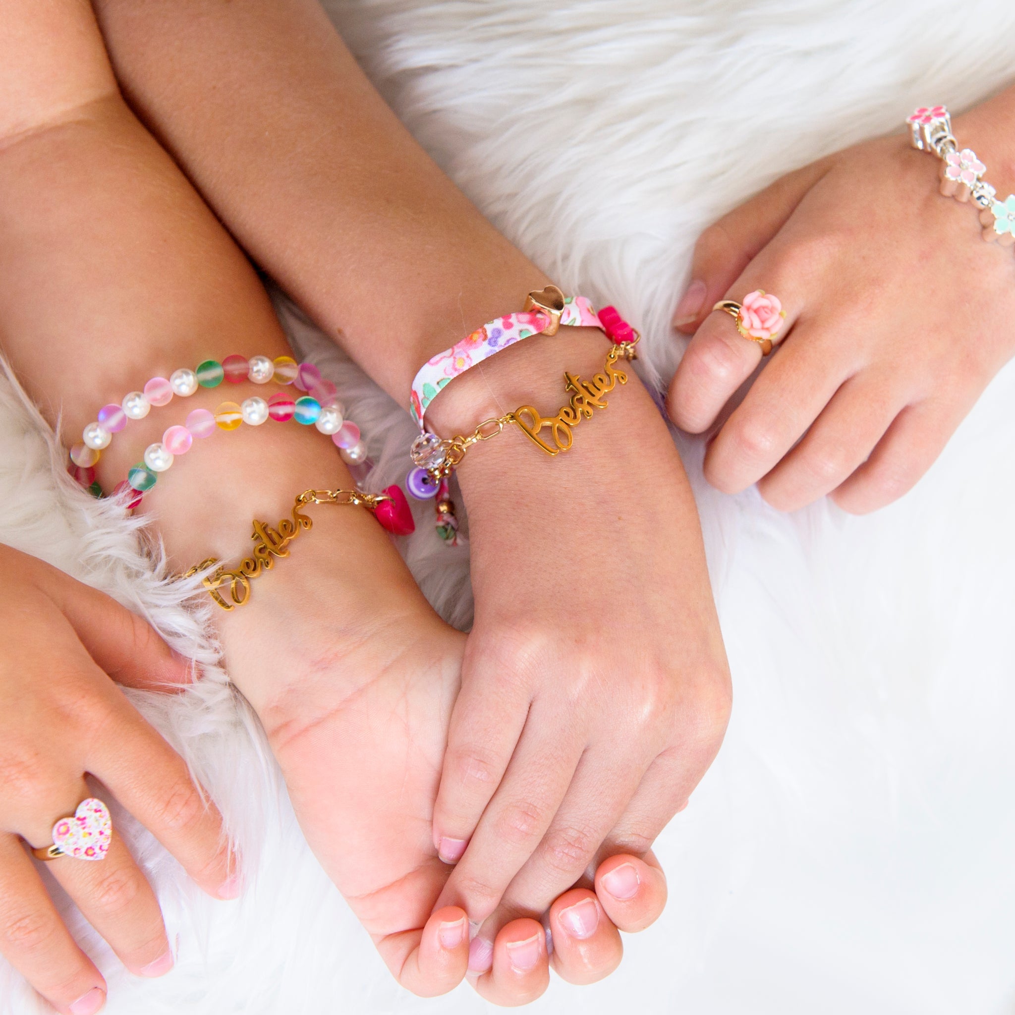 Let the world know who your BFF is, and let your BFF know how much they mean to you. Including a violet stripe charm and a tassel and a gorgeous pink heart – the combination of violets and pink and crystal with “Besties” spelled out in gold means this bracelet can be for both younger children and tweens (even teens with a sense of high fashion and fun)