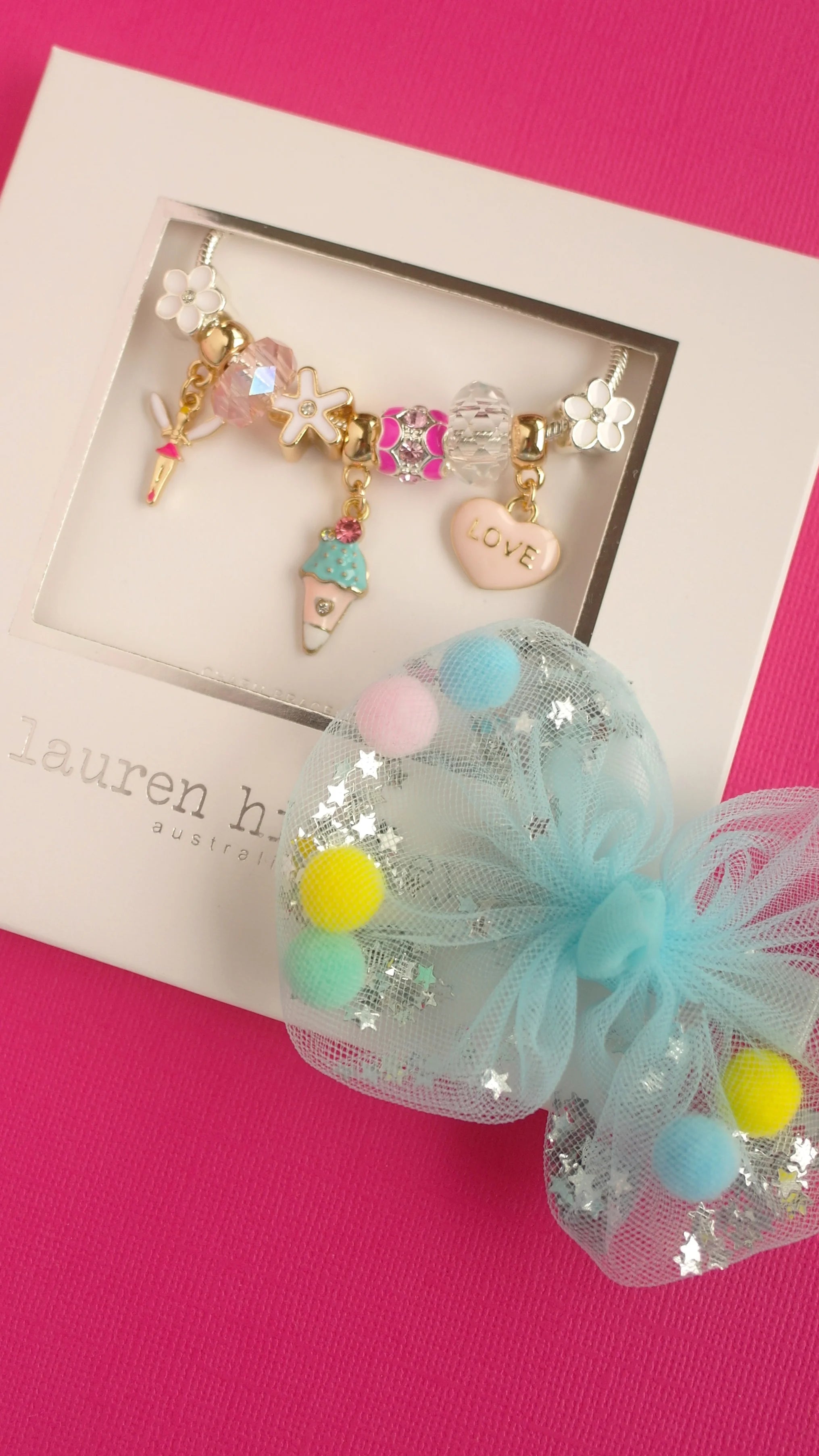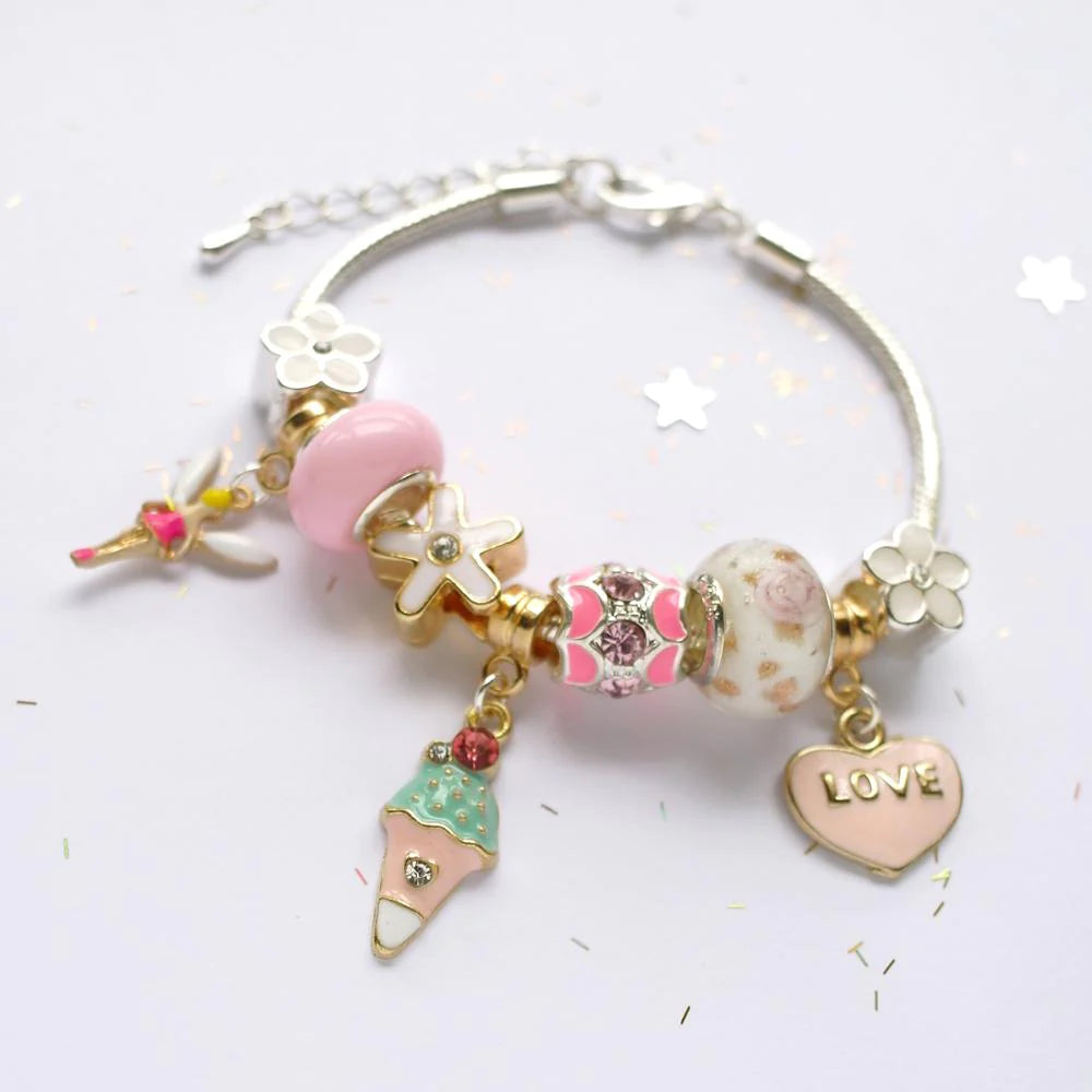 The Pretty Posy Charm Bracelet is a soft pink and purple ombre, blending the two colours along the line of charms from lavenders to pale pinks. Each flower is shaded a little differently, giving the bracelet plenty of interest. It also includes a large, sparkling diamante filled star and a beautiful white pendant covered in lavender flowers.