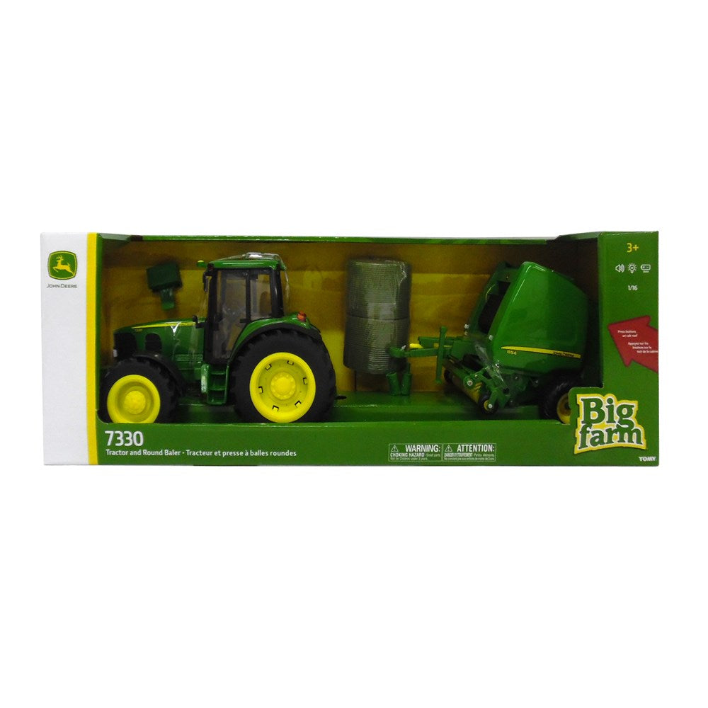Designed with both indoor and outdoor play in mind, the Big Farm Lights & Sounds John Deere 7330 Tractor and Round Baler set is a great addition to any sand pit collection. This toy tractor features lights and sounds for plenty of realistic playtime action. There are also removable weights and an opening hood on the tractor and the round baler comes with two bales that gives your little farmer plenty to do. This farm toy set includes 3 AAA batteries so the fun can start right away.