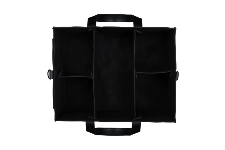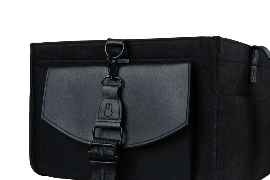 The Bunnie Caddie is made from premium felt fabric that provides a sturdy base and sectional caddie, leather trim and metal hardware for a sleek look, plus a leather strap for durability and ease of transport.