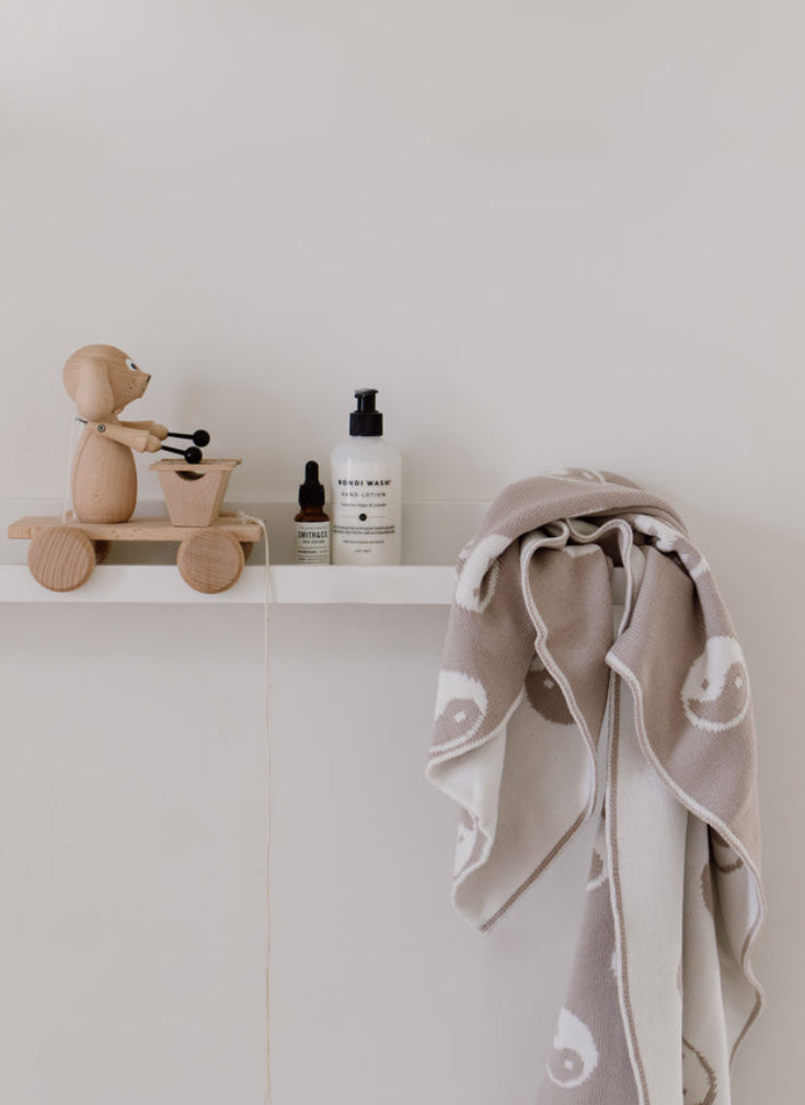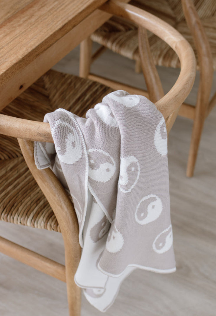 Back by popular demand, we are selling a limited amount of this gorgeous, reversible jacquard knit yin yang blanket.