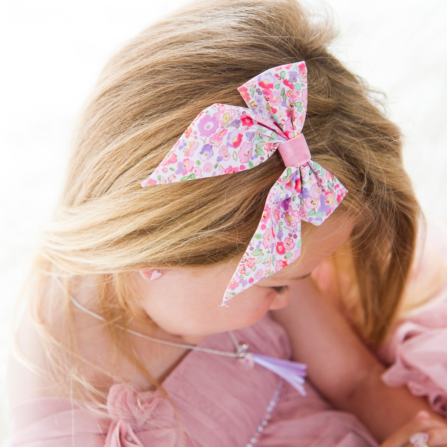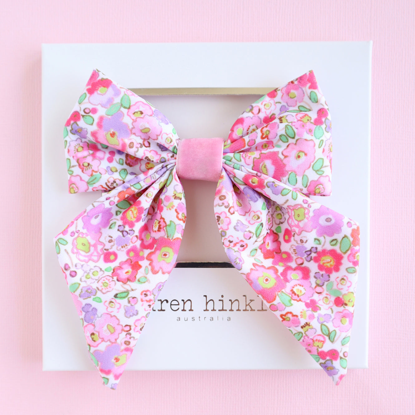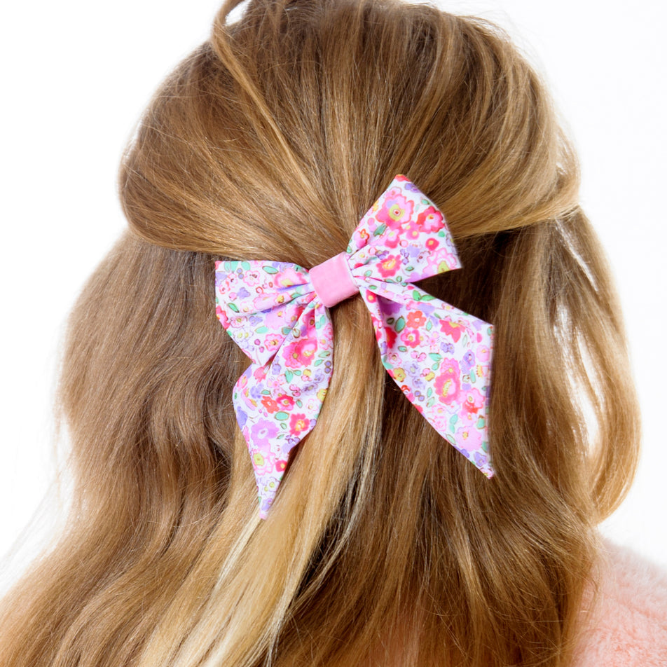 Never know what to do with their hair? Sometimes it is just easy and fun to stick a big bow on it! The Petite Fleur Bow Hair Clip features a detailed floral pattern, filled with little flowers in a rainbow of colours, and a pink velvet band around the centre.