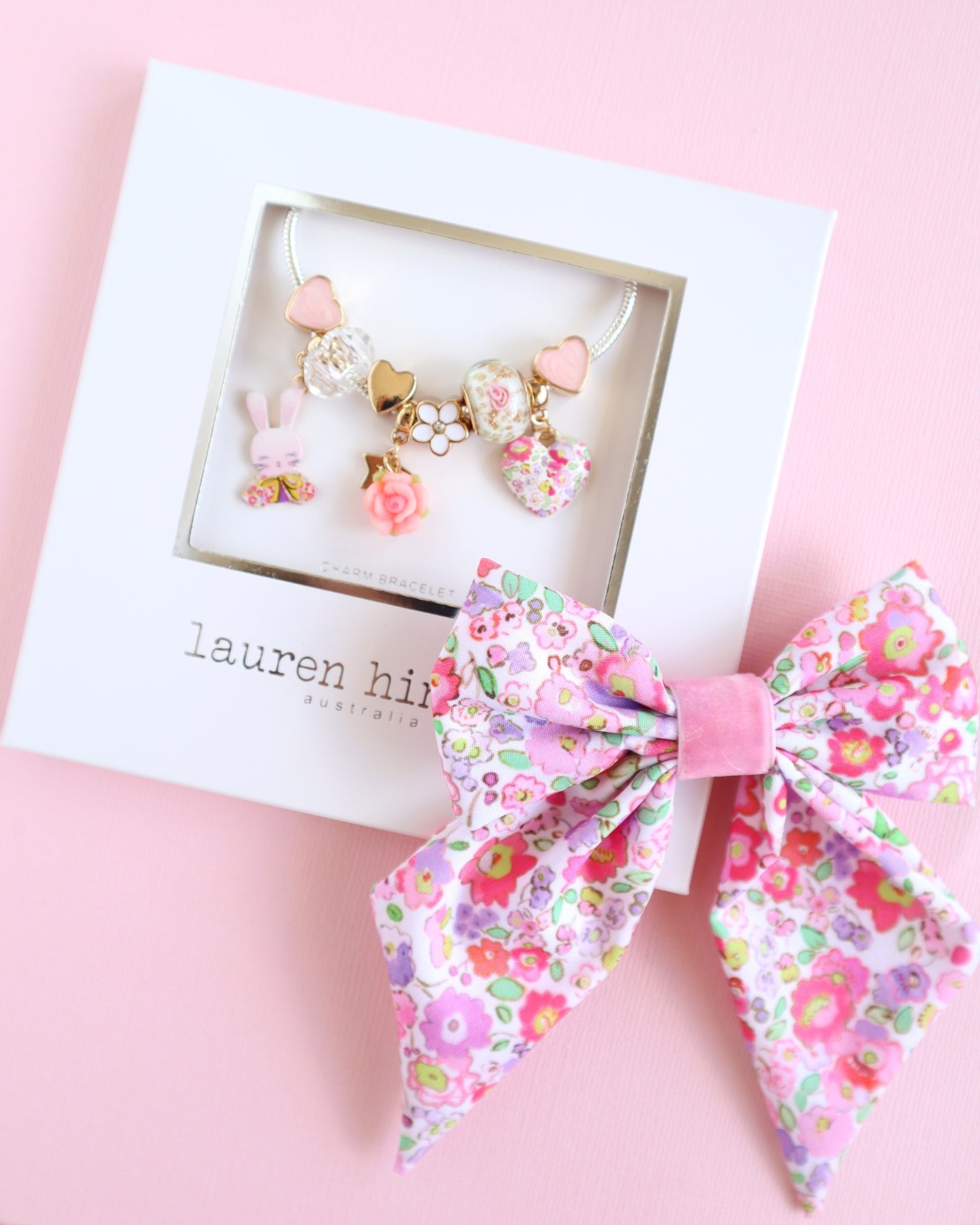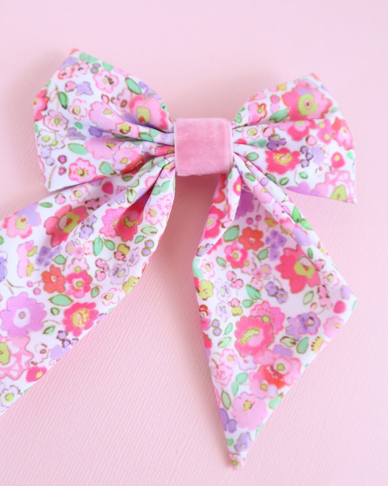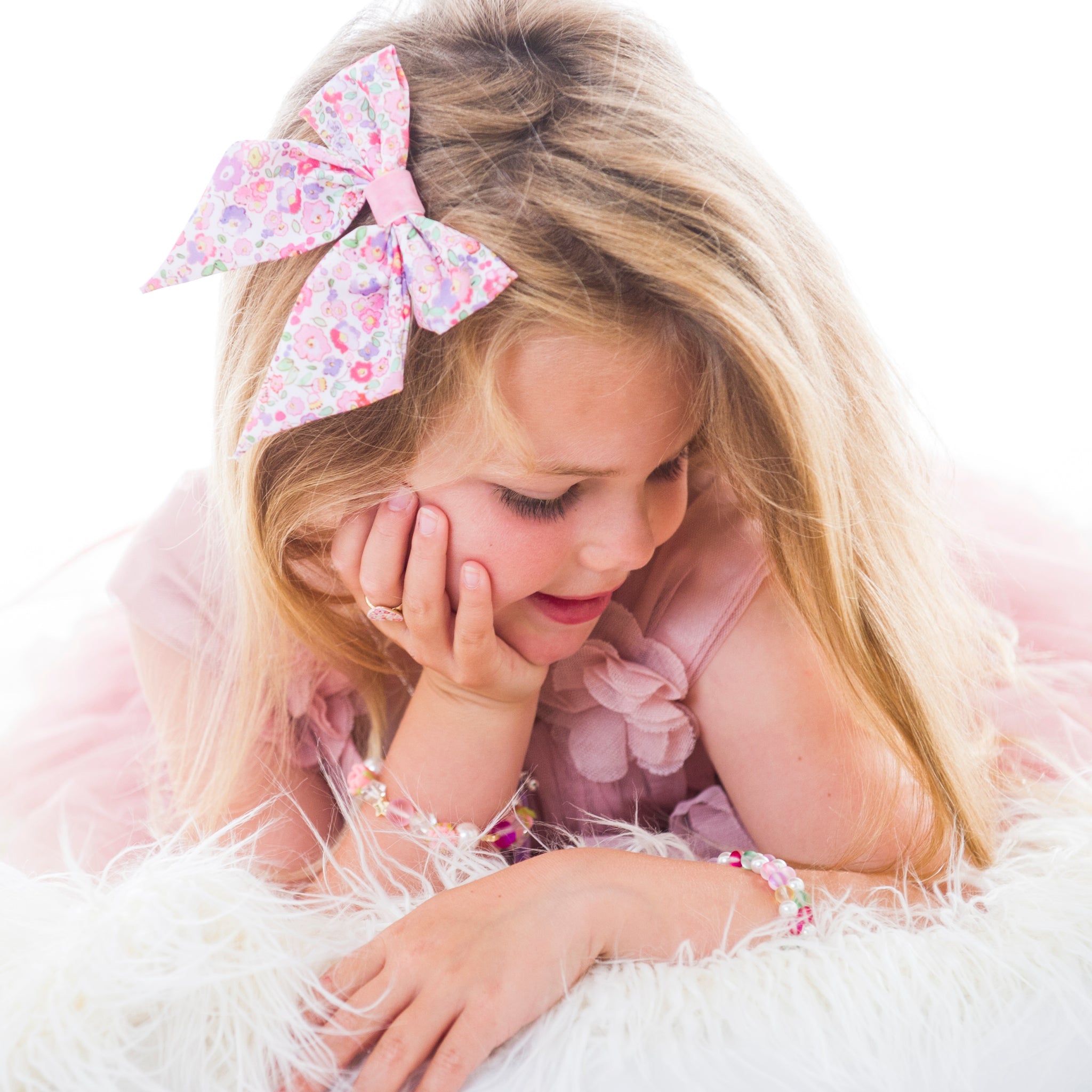 Never know what to do with their hair? Sometimes it is just easy and fun to stick a big bow on it! The Petite Fleur Bow Hair Clip features a detailed floral pattern, filled with little flowers in a rainbow of colours, and a pink velvet band around the centre.