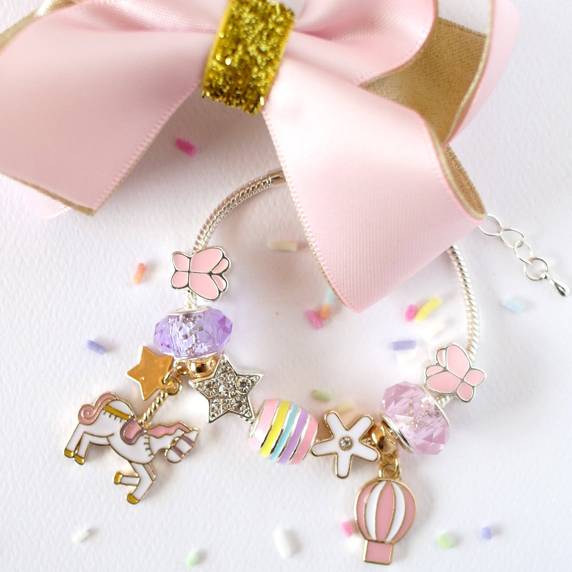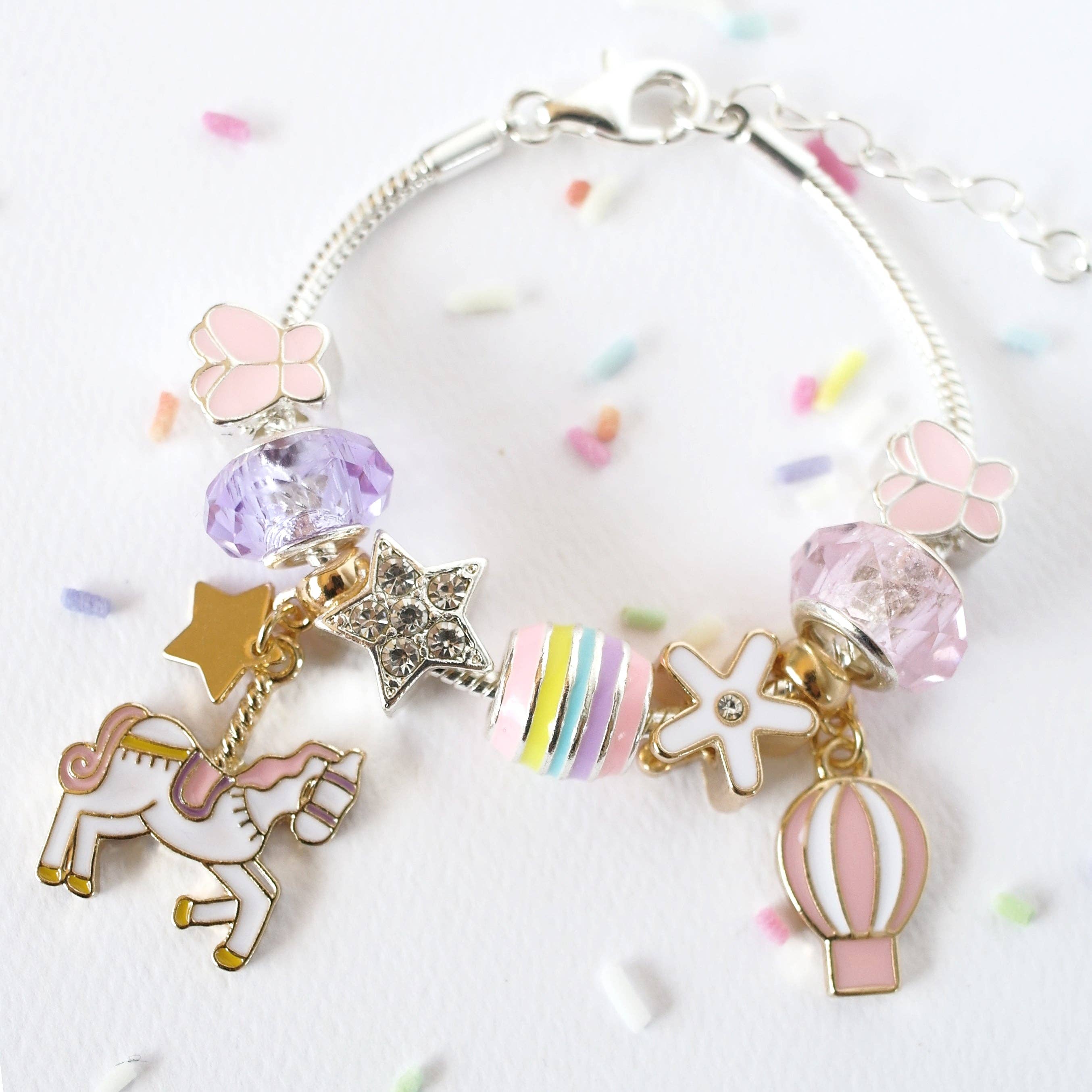 Join this whimsical race between a carousel horse and a hot air balloon! Who will make it to the candy stripe charm in the middle first? Will the shining silver star and its crystals dazzle the carousel horse? Or did the stunning white flower stop the hot air balloon in its flight?