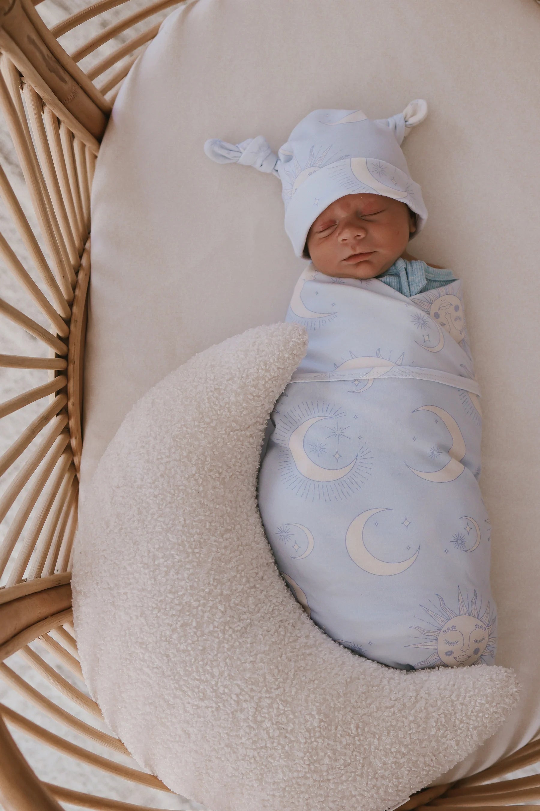 Our Celestial design is now available in a blue colourway! This design features intricate sun and moon illustrations, alongside stars.