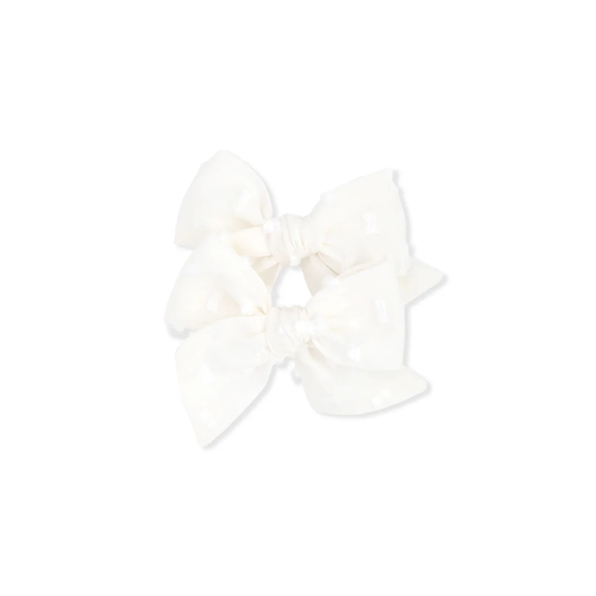Our pigtail set includes two mini pinwheel bows on clips (one left-side clip and one right-side clip)