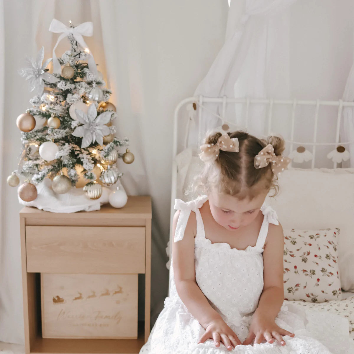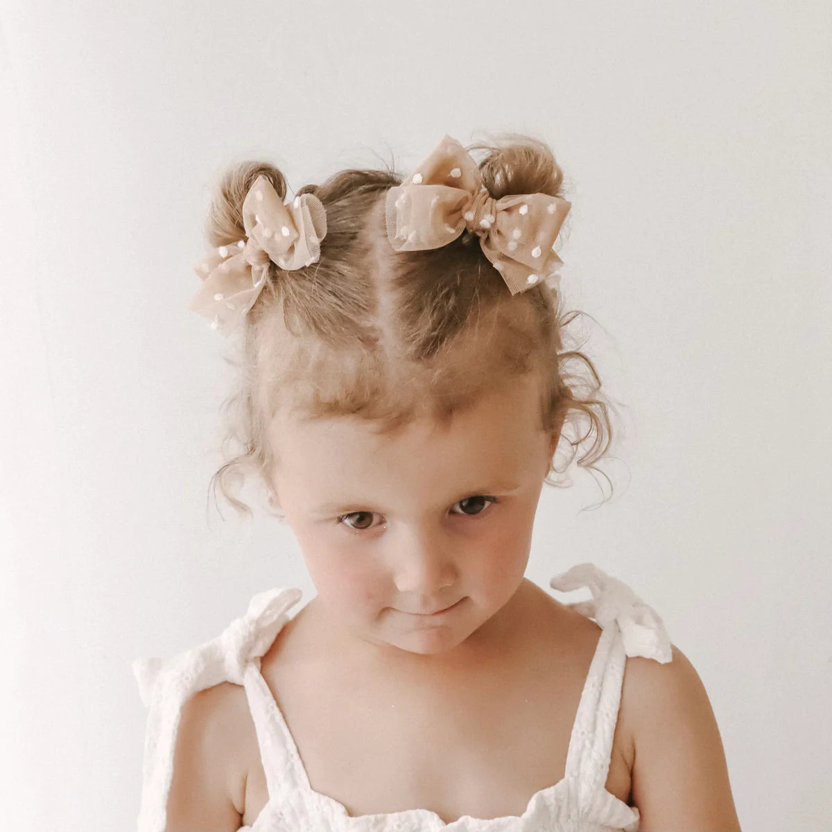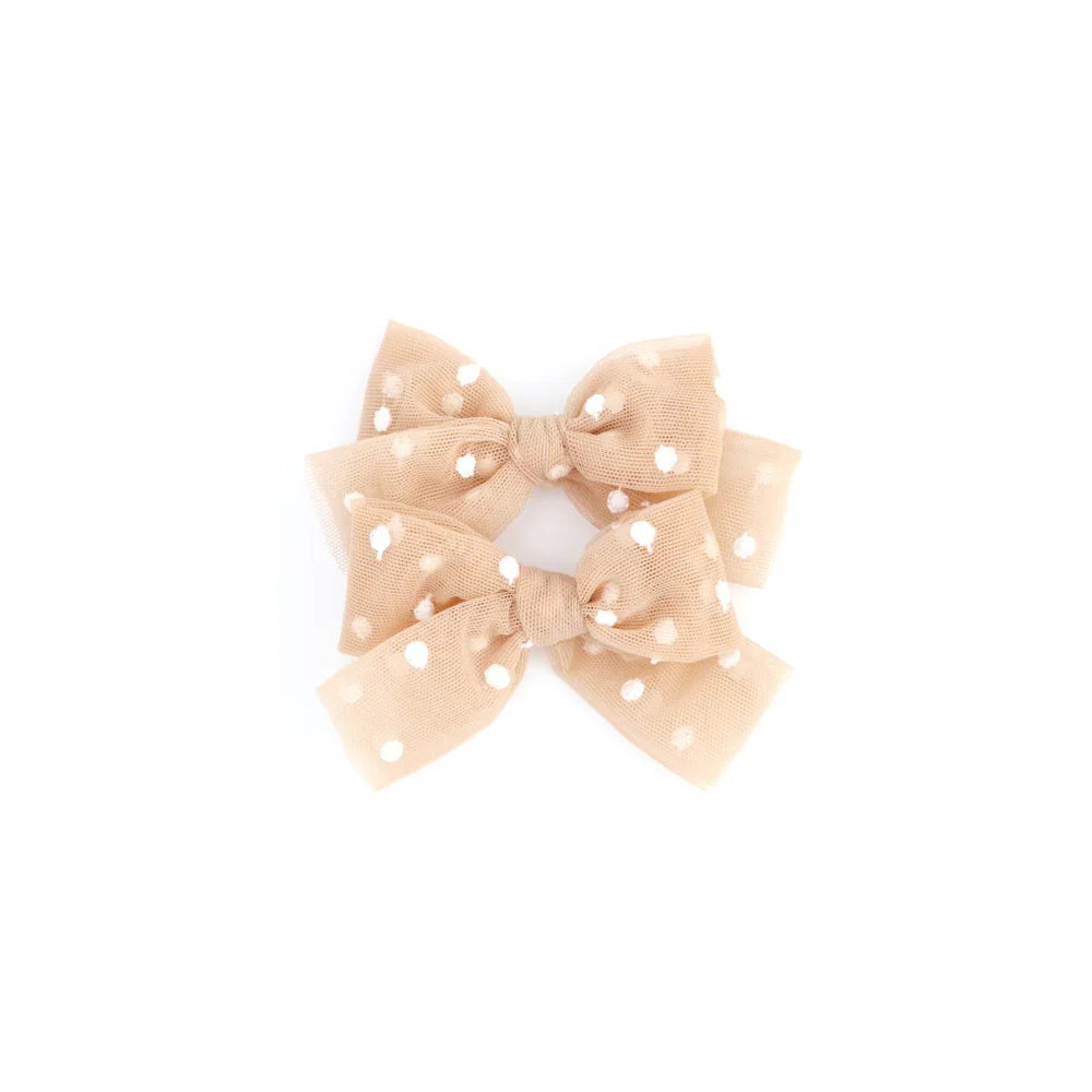 Our tulle pigtail set includes two mini tulle bows on clips (one left-side clip and one right-side clip)