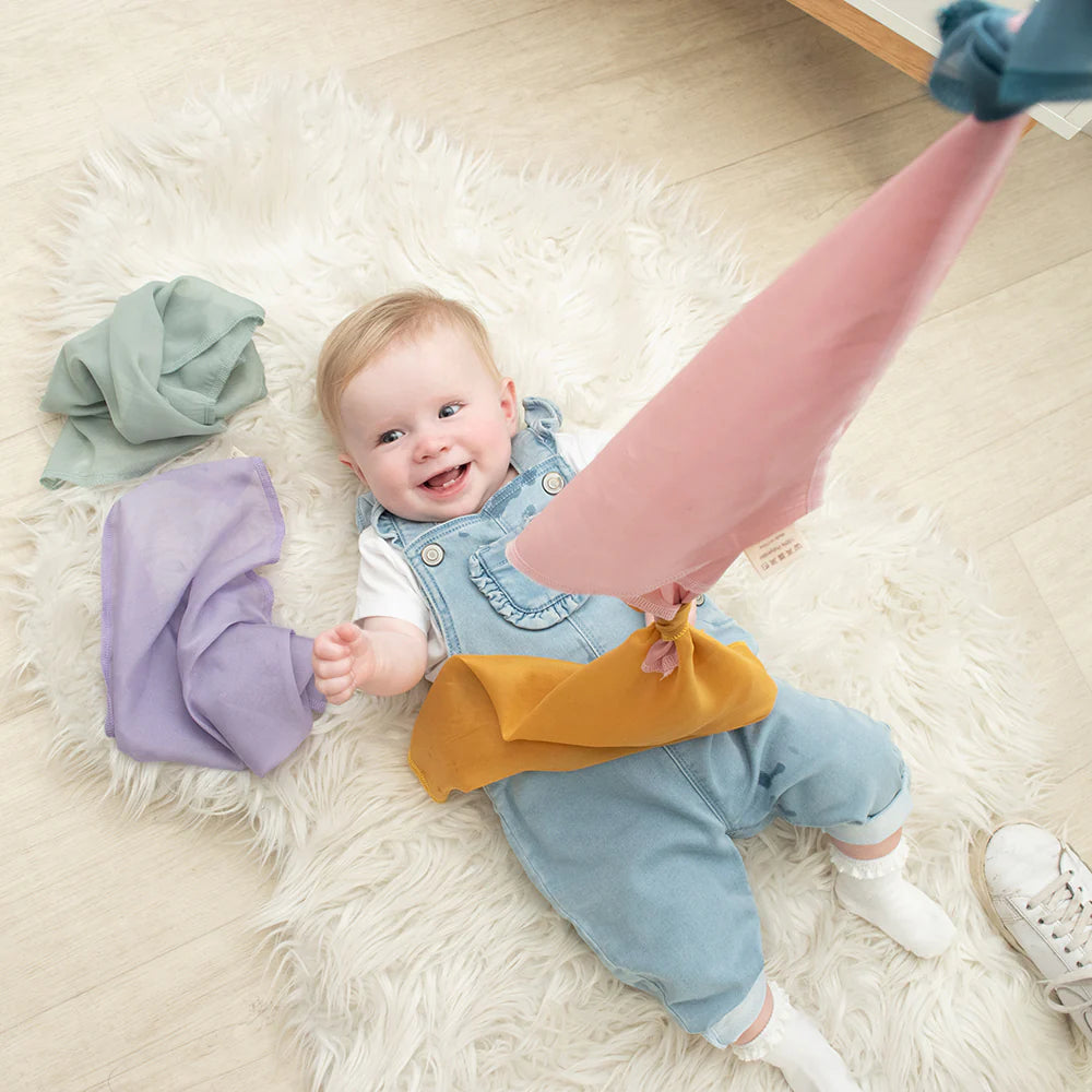 - Baby will love pulling out the 5 colourful Sensory Scarves from the sensory cube. This can help teach baby about object permanence (the concept that things still exist even when removed from sight) and are also ideal for imaginative play and dance.