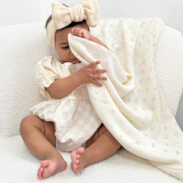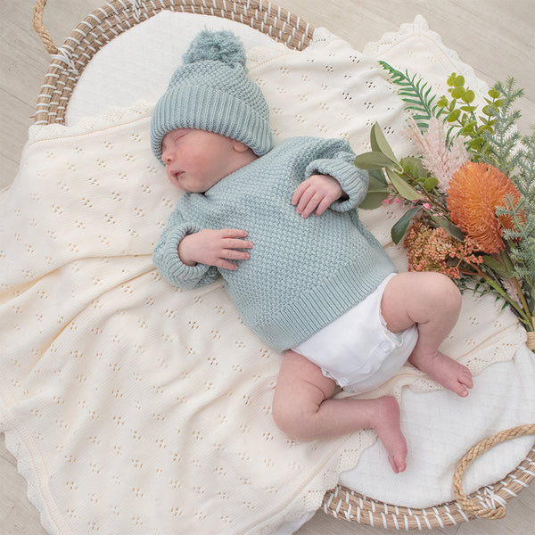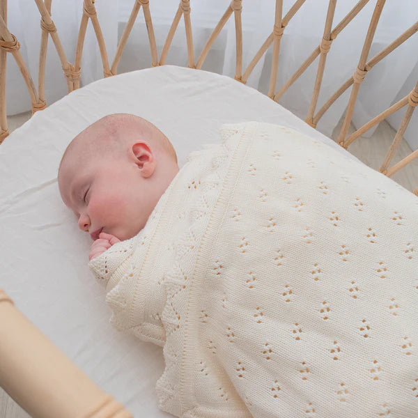 Keep your little one warm and cosy with the beautifully soft bamboo/cotton knit blend heirloom blanket. Featuring a pointlet knit design and delicate knitted lace trim, this light weight, breathable blanket is sure to be loved by carers and baby alike.