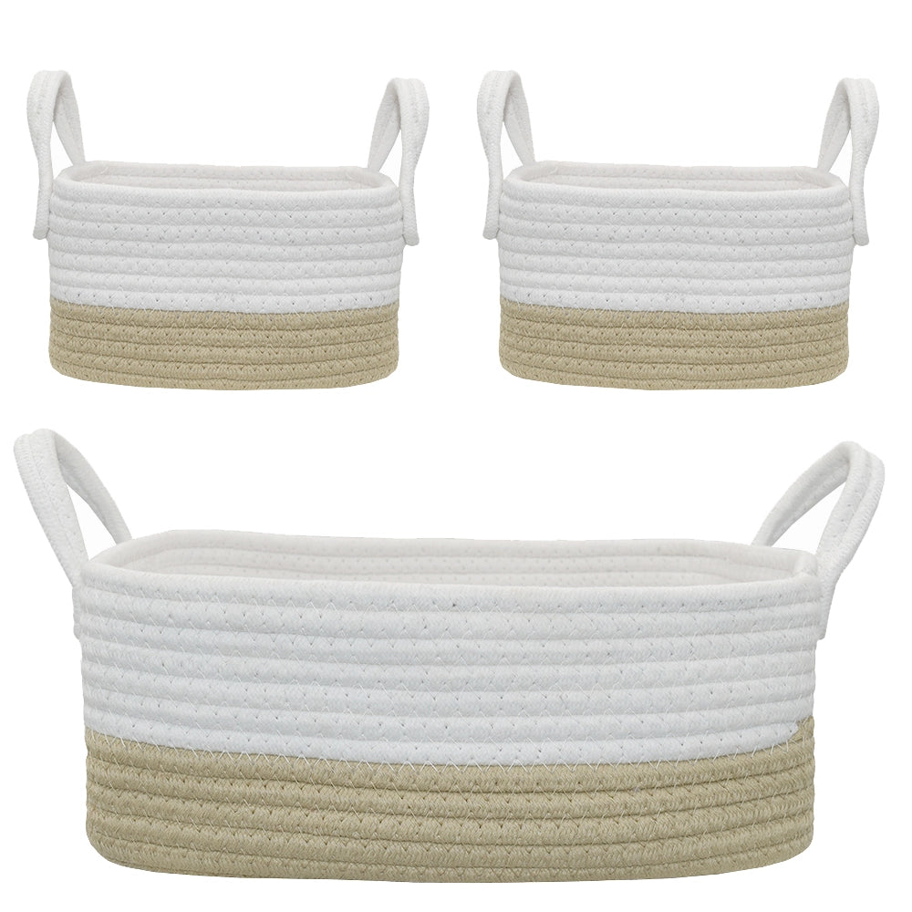 Keep your nursery neat and tidy with this 100% cotton rope 3-piece storage set. Perfect under the changing table or on top of drawers, this set includes one large and two small baskets, giving you ample room for storing diapers, wipes, lotions and other baby items.