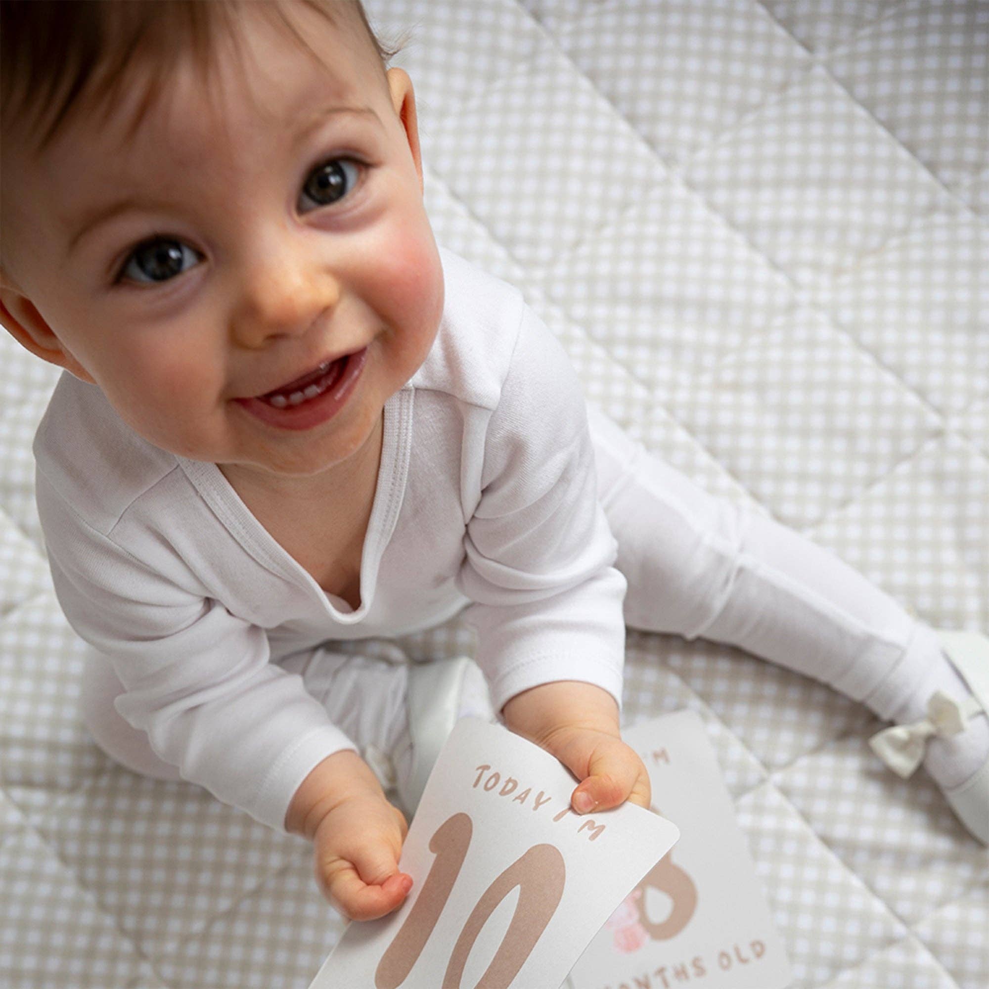 This set of 13 double-sided milestone cards features some of your little one's big moments. From hello world to 1 year old, these matte, heavyweight cardstock cards are perfect as a baby shower, new baby present and nursery decorations.