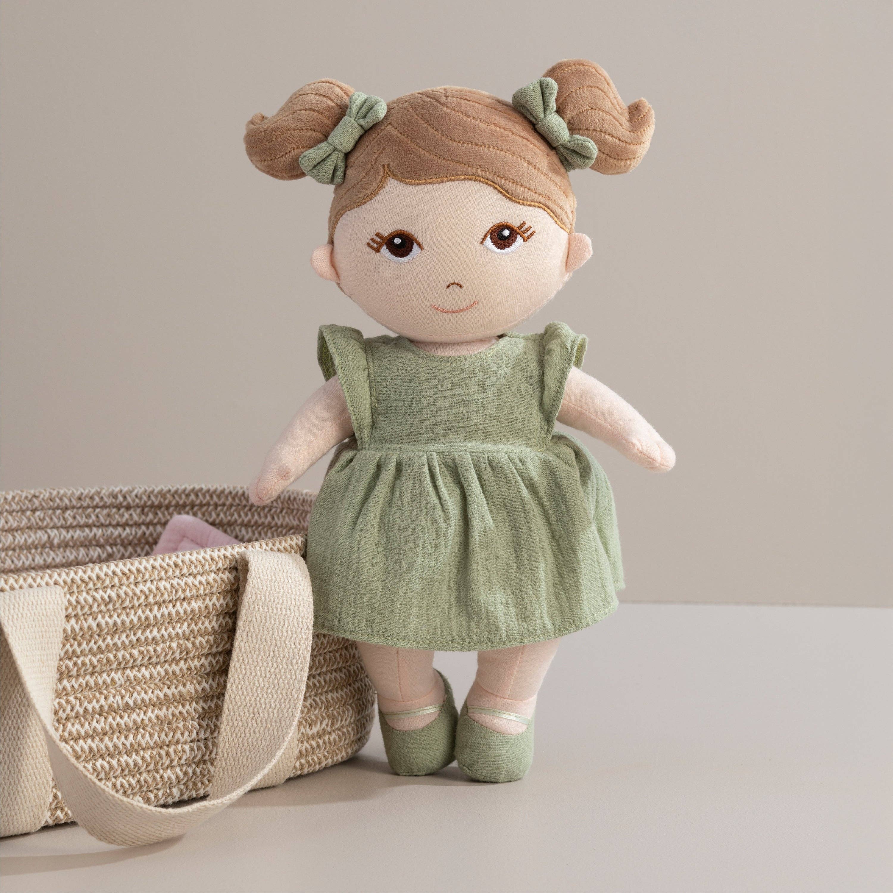 Featuring an endearing embroidered face, and 100% cotton muslin dress, Elena is sure to become baby’s favourite playtime friend.