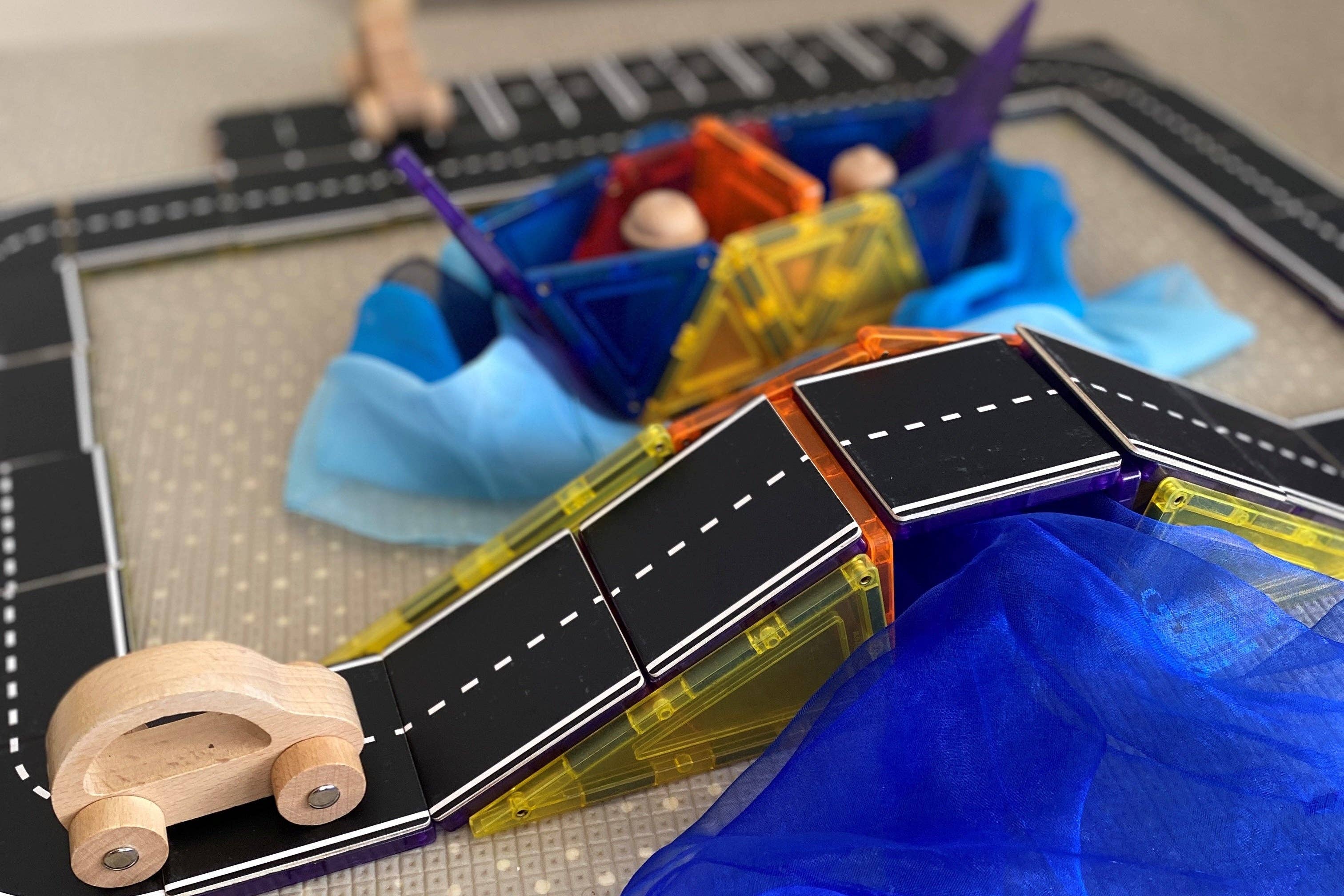 Our 40 piece pack allows you to create roads by adding our tile toppers to your existing magnetic tiles. With a variety of road pieces, intersections, curves, and more, your child can create unique transportation routes for their toy cars, enhancing imaginative play.