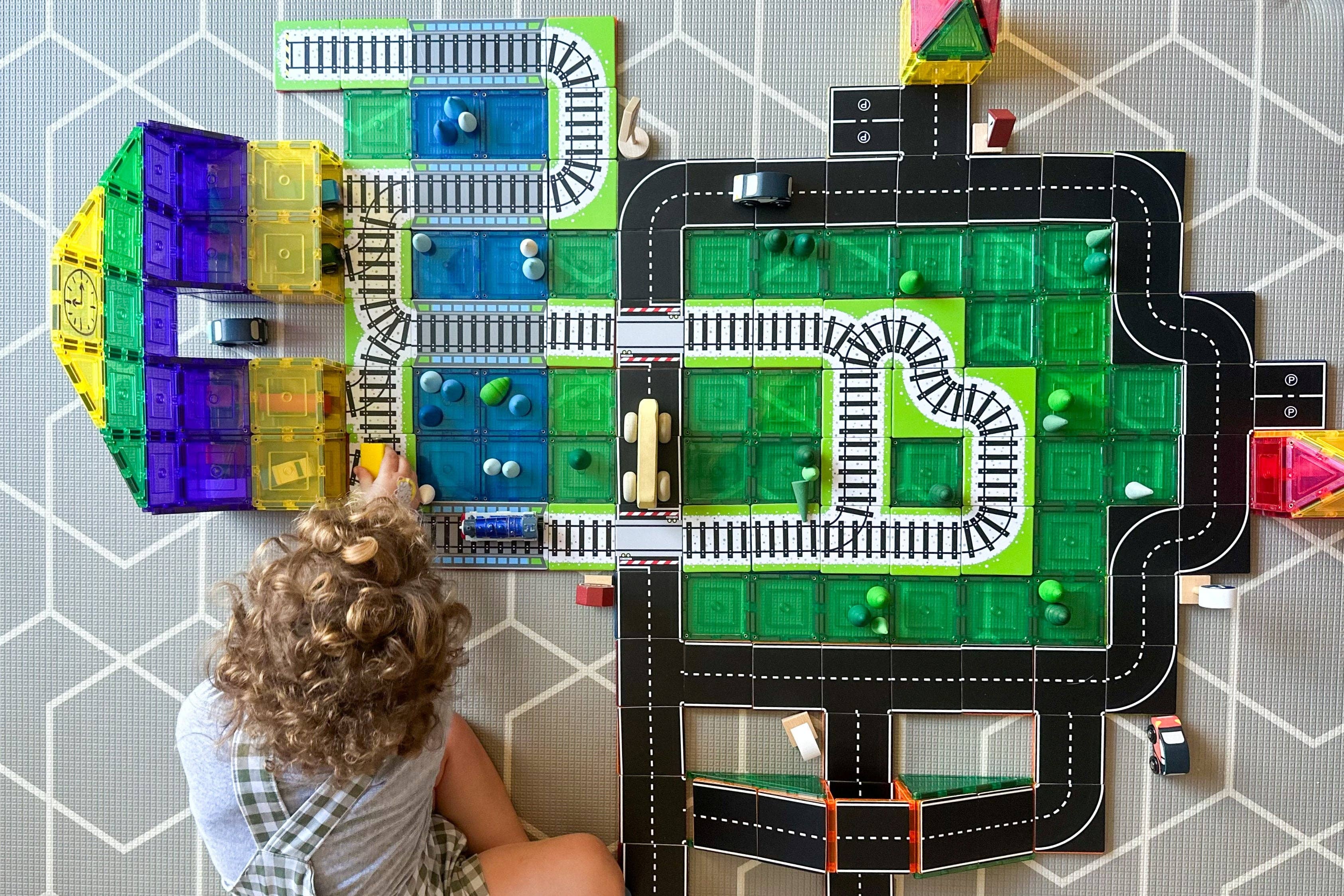 Our 36 piece pack allows you to create train tracks by adding our tile toppers to your existing magnetic tiles. We have created this train track set to work seamlessly with our road track with the use of our level crossings.