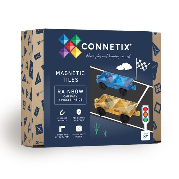 Add a new dimension to your magnetic tile play and get your imagination moving! The CONNETIX 2 Piece Rainbow Car Pack includes one blue and one yellow motion base featuring REAL rubber wheels and our unique bevel design. This pack adds to the endless possibilities of CONNETIX magnetic tiles, promoting endless possibilities for children to design and create their own motion structures from cars, trucks, trains, buses, fire trucks, tractors and space cars, to moving robots, fantastical creatures, and so much more!