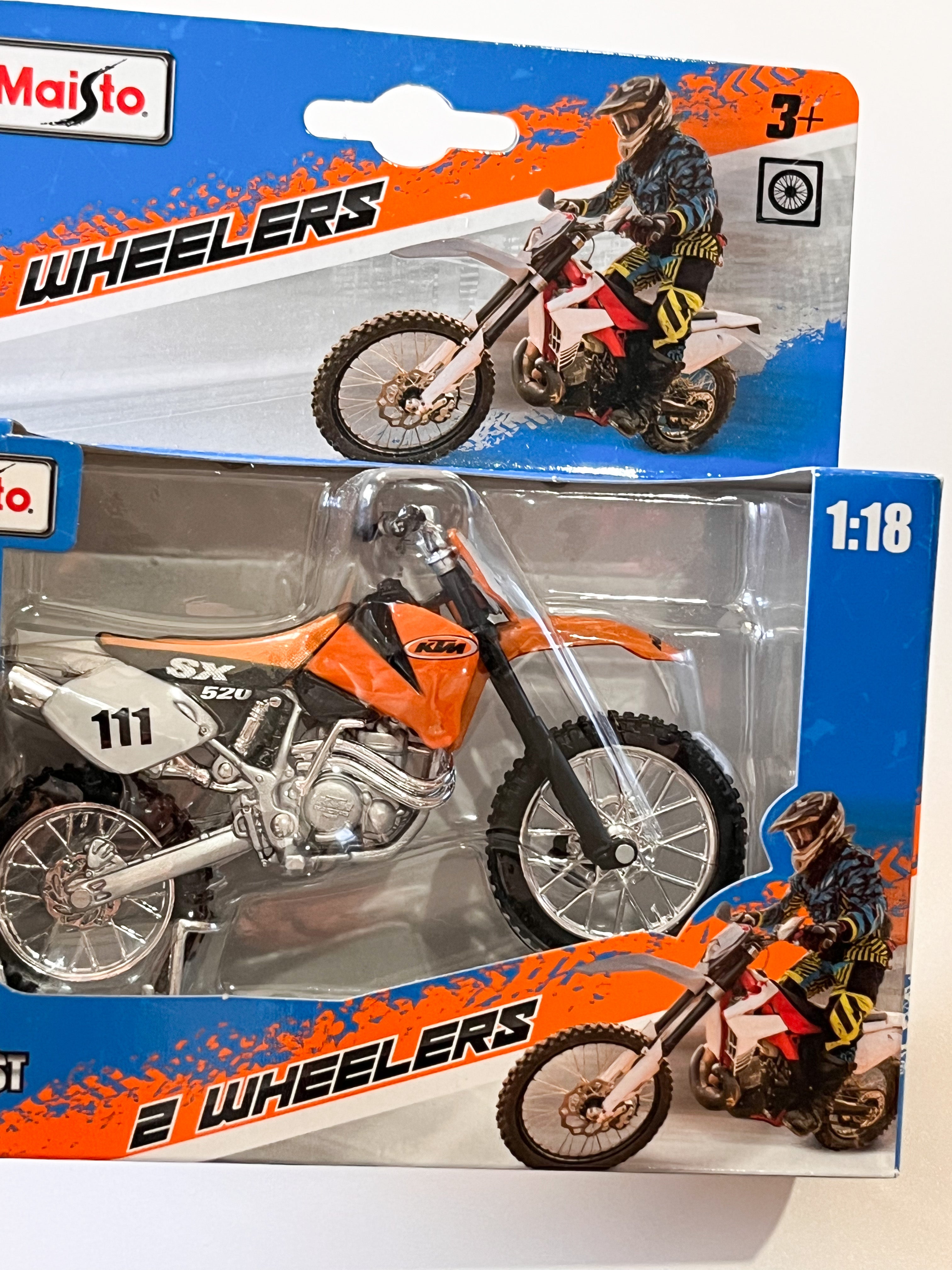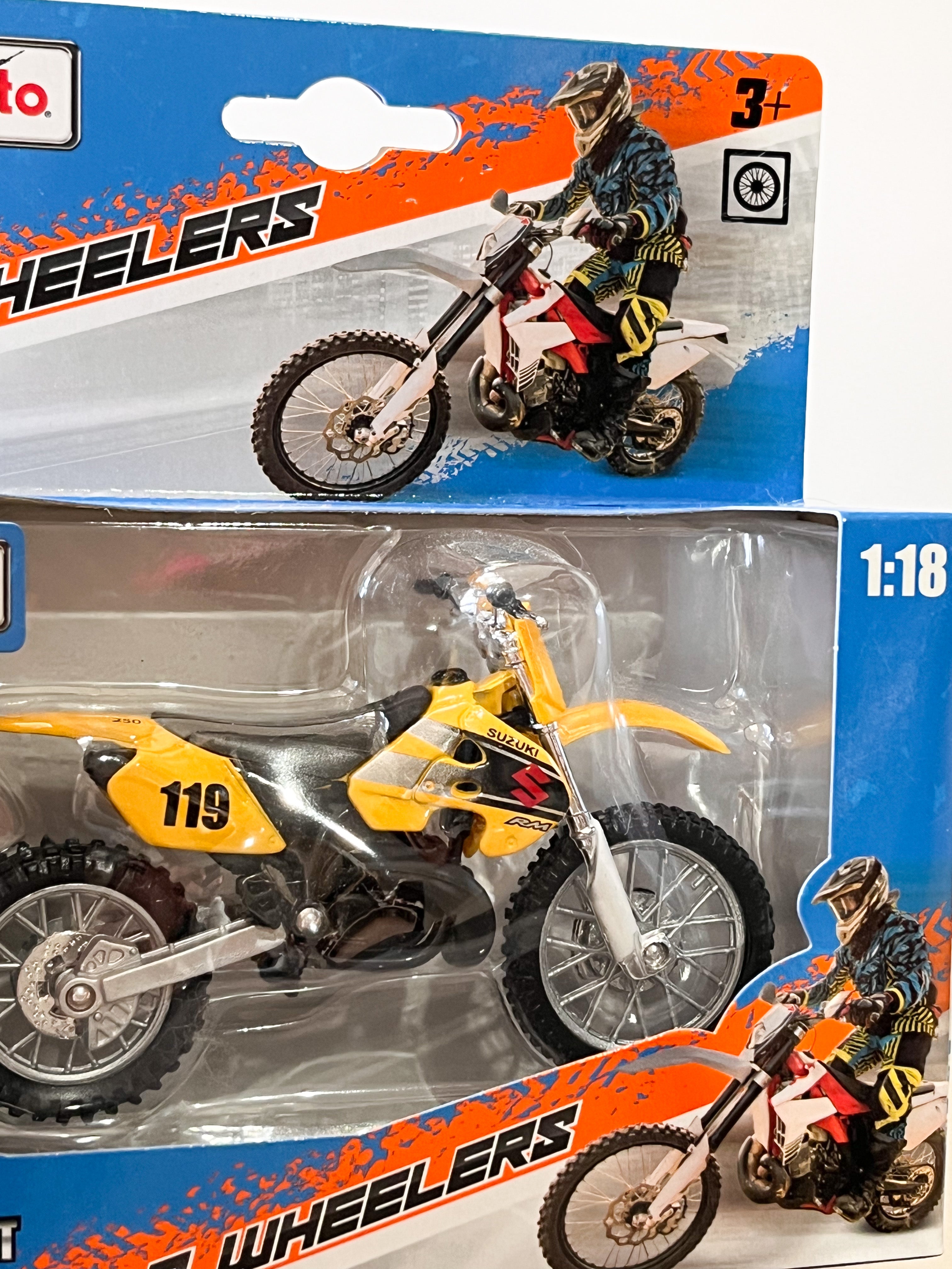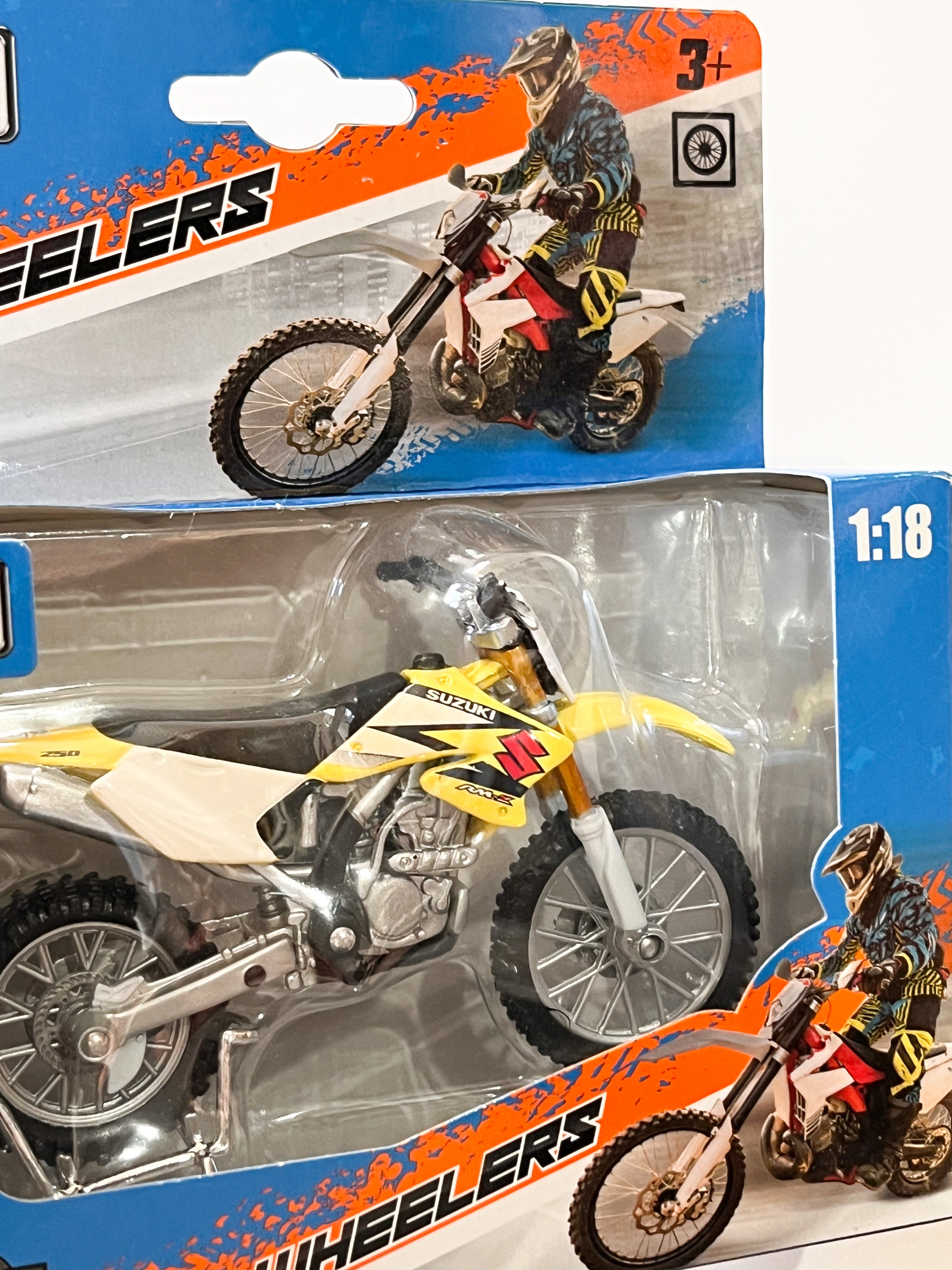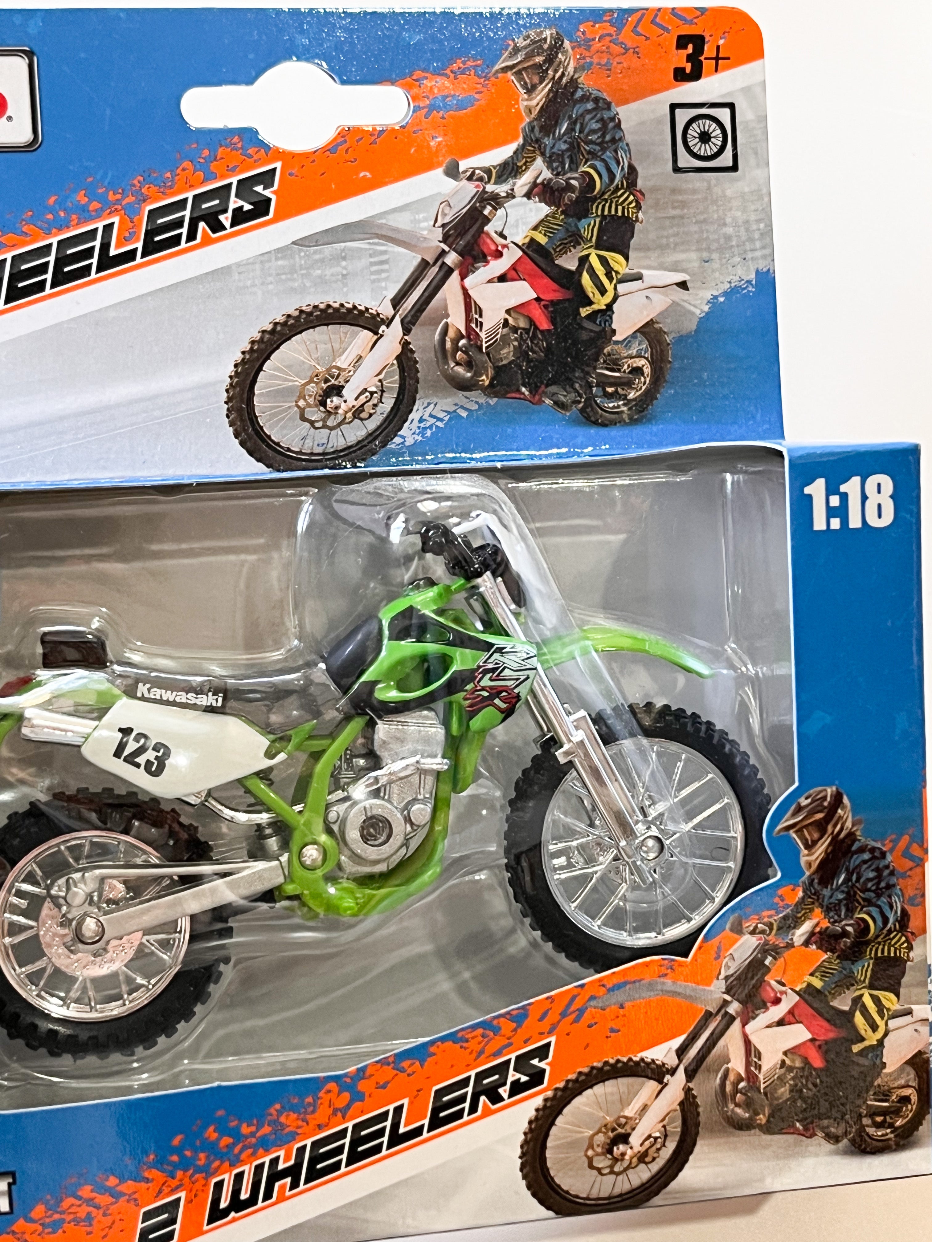 Die-cast metal 1:18 scale motorbikes with plastic parts. With working steering, working rear suspension, working stand as well as free motorcycle wheels, made from top quality rubber tires and all in excellent detail.Altogether a perfect model measuring about 12 cm long and 7 cm high.