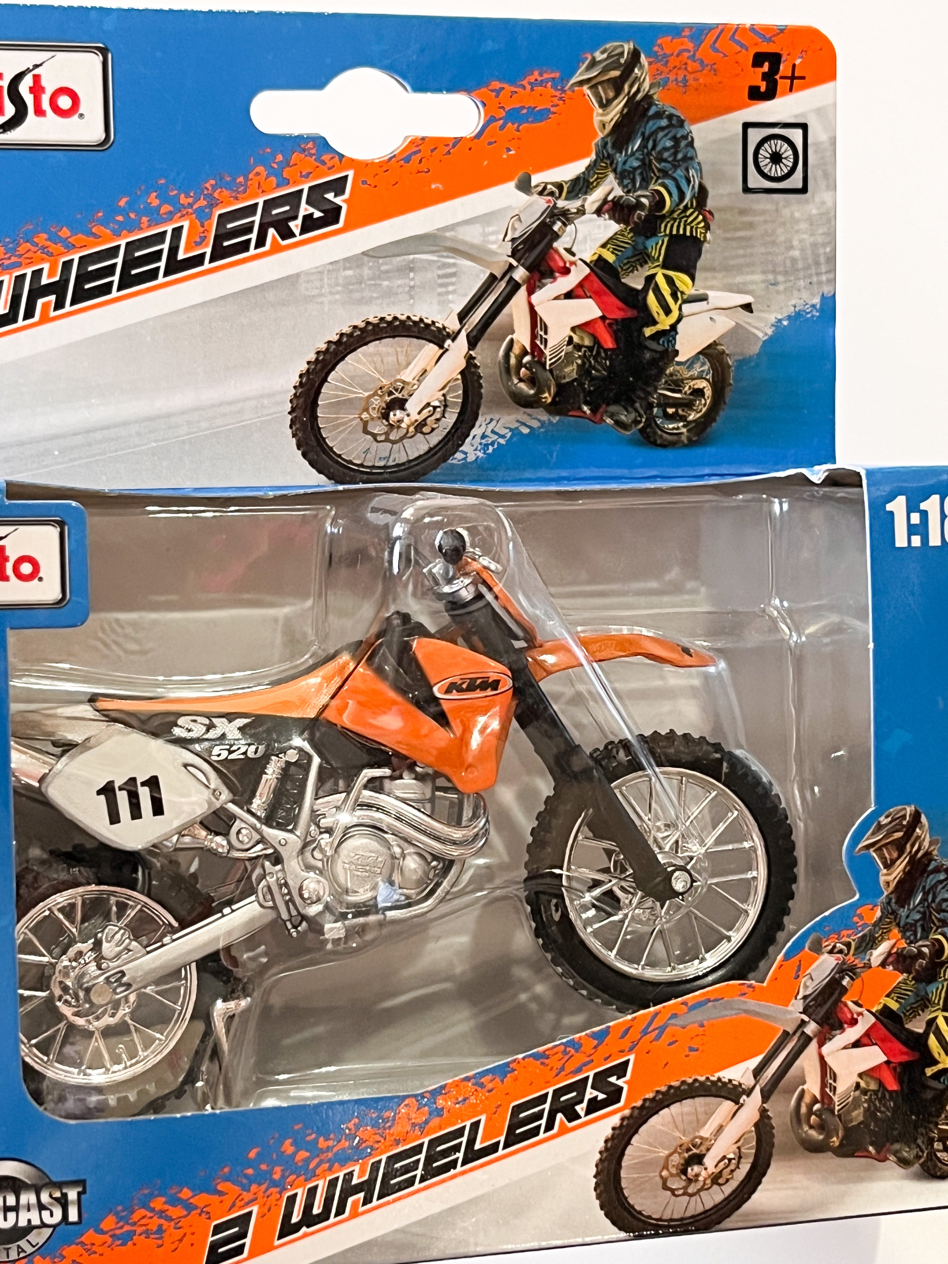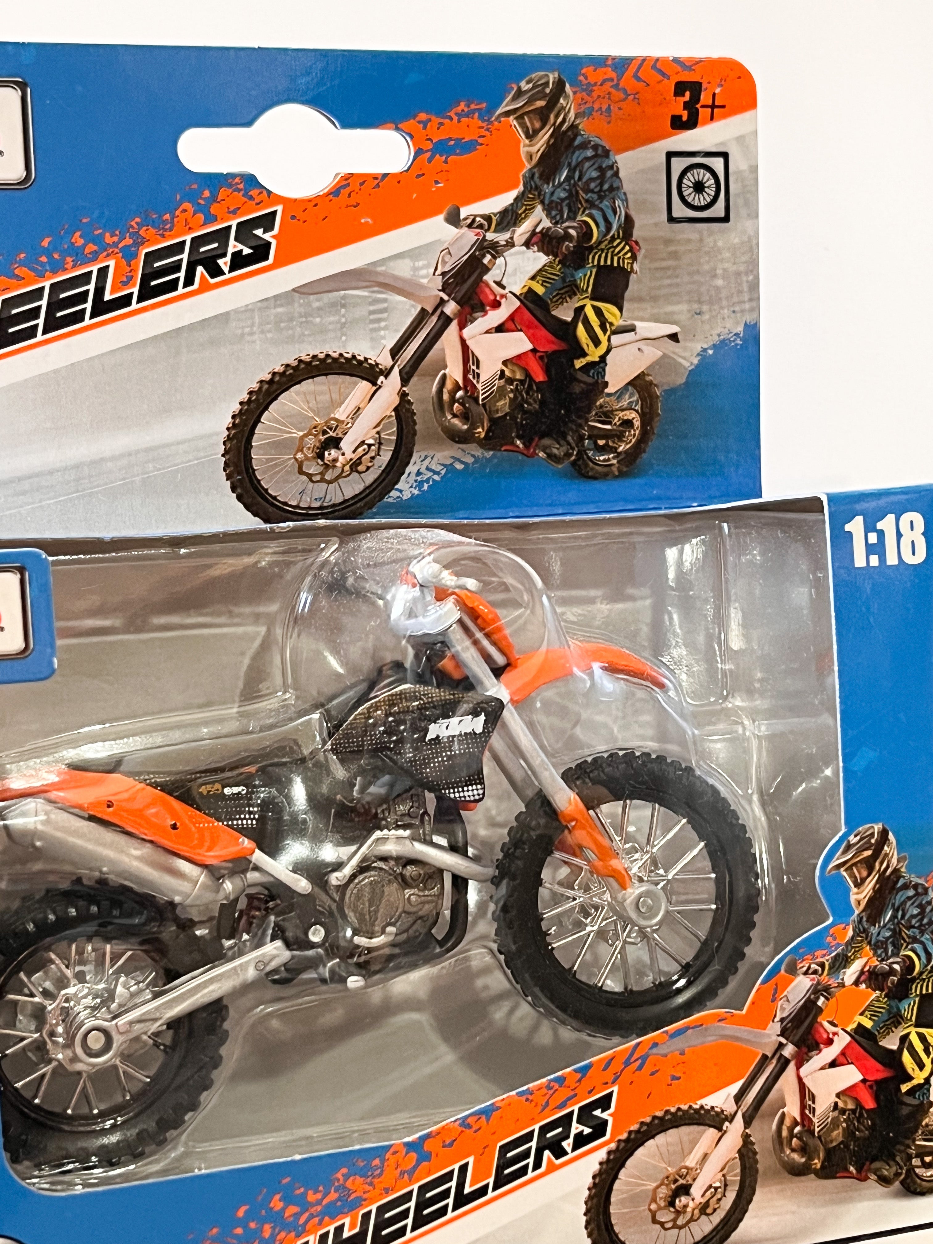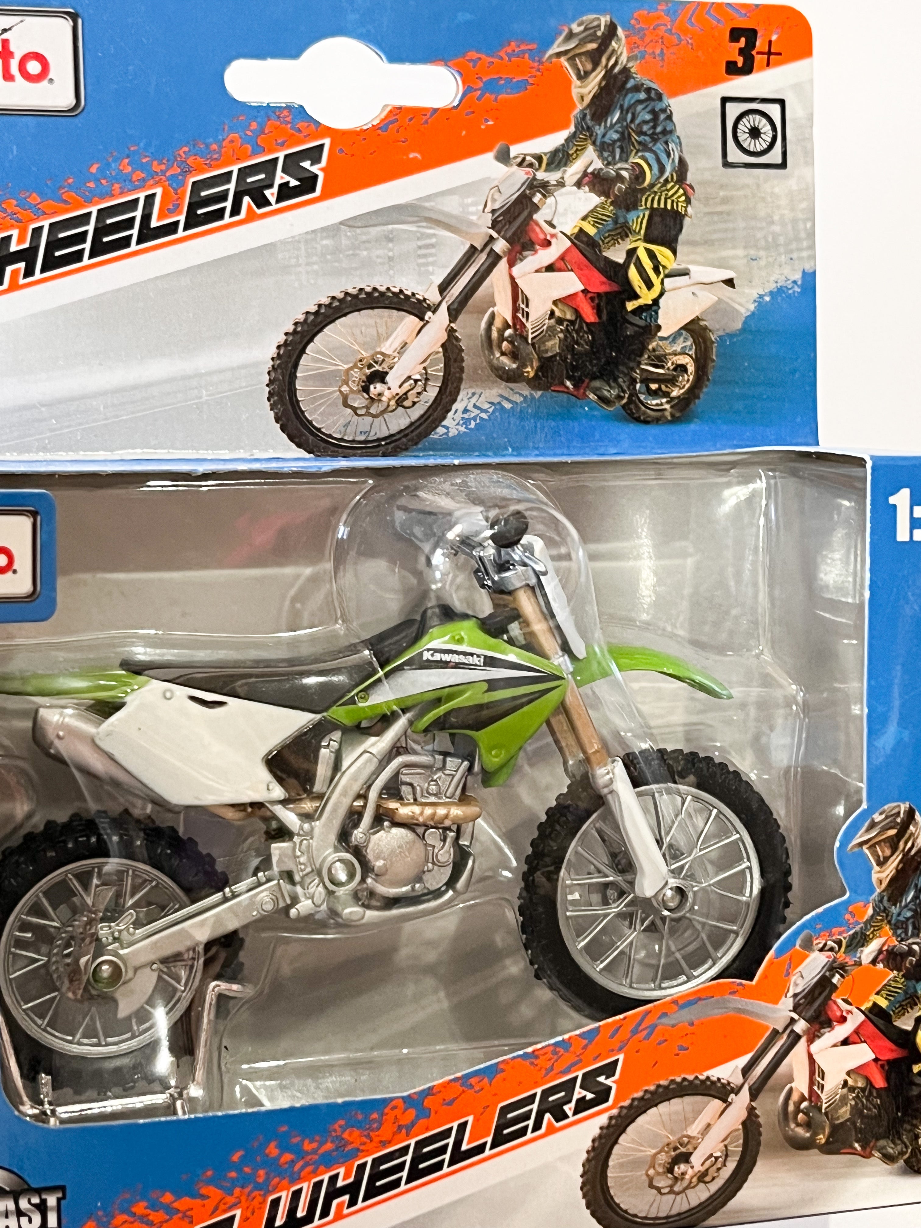 Die-cast metal 1:18 scale motorbikes with plastic parts. With working steering, working rear suspension, working stand as well as free motorcycle wheels, made from top quality rubber tires and all in excellent detail.Altogether a perfect model measuring about 12 cm long and 7 cm high.