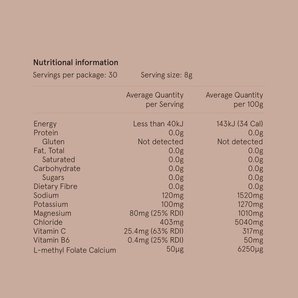 Electrolyte Mineral Salts Blend: Magnesium Chloride, Sodium Chloride, Mono Potassium Phosphate, Sodium Citrate. This blend helps to ensure you are hydrated to the optimal level.
