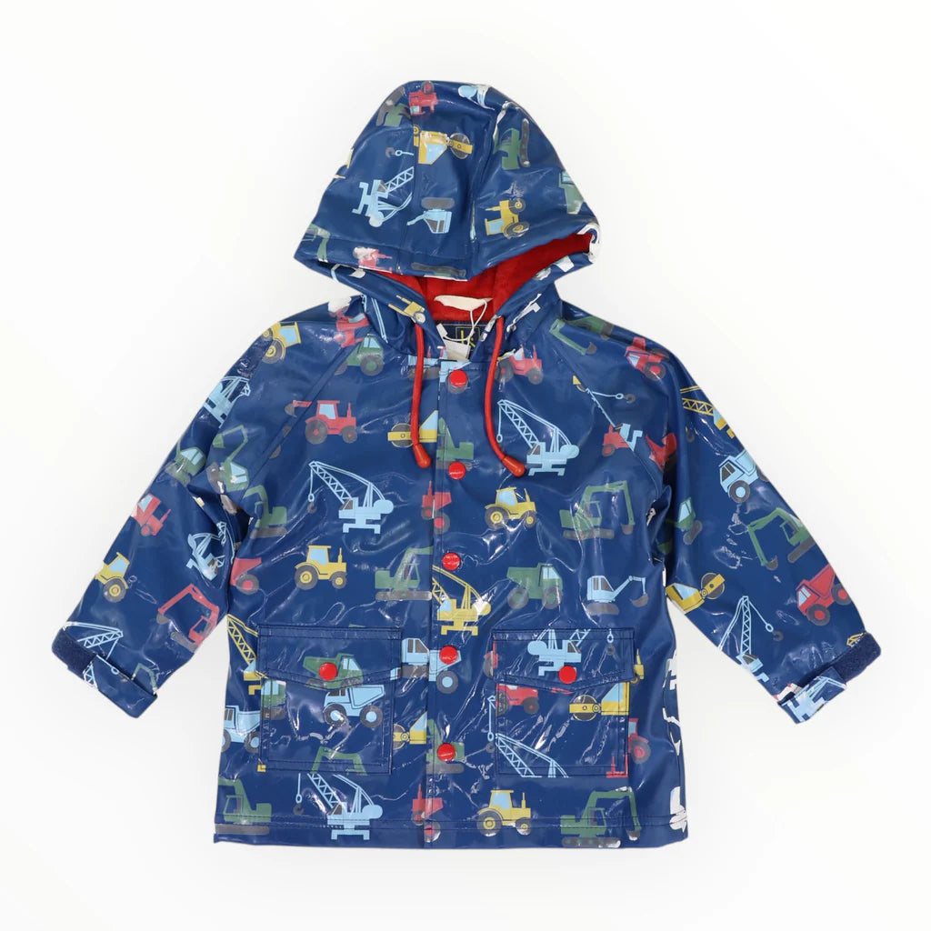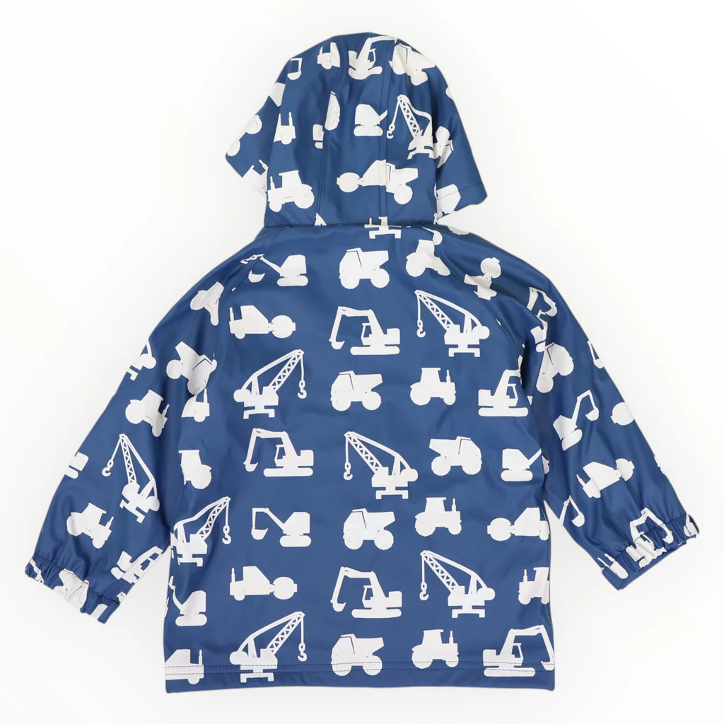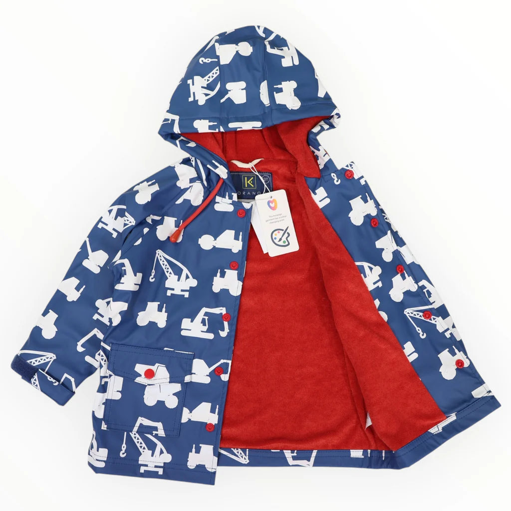 Introducing Korango's Colour Change Construction Raincoat - the perfect way to keep your kids both dry and stylish! This is no ordinary raincoat, as it features a white construction vehicle print that changes to bright, vivid colours when it gets wet! Your little one will love it, and you can too, with its PU outer and terry towelling lined for extra comfort. It goes on and off easily with red front snap buttons, so your little one will be able to enjoy it for hours. It'll be sure to put a smile on their face come rain or shine!