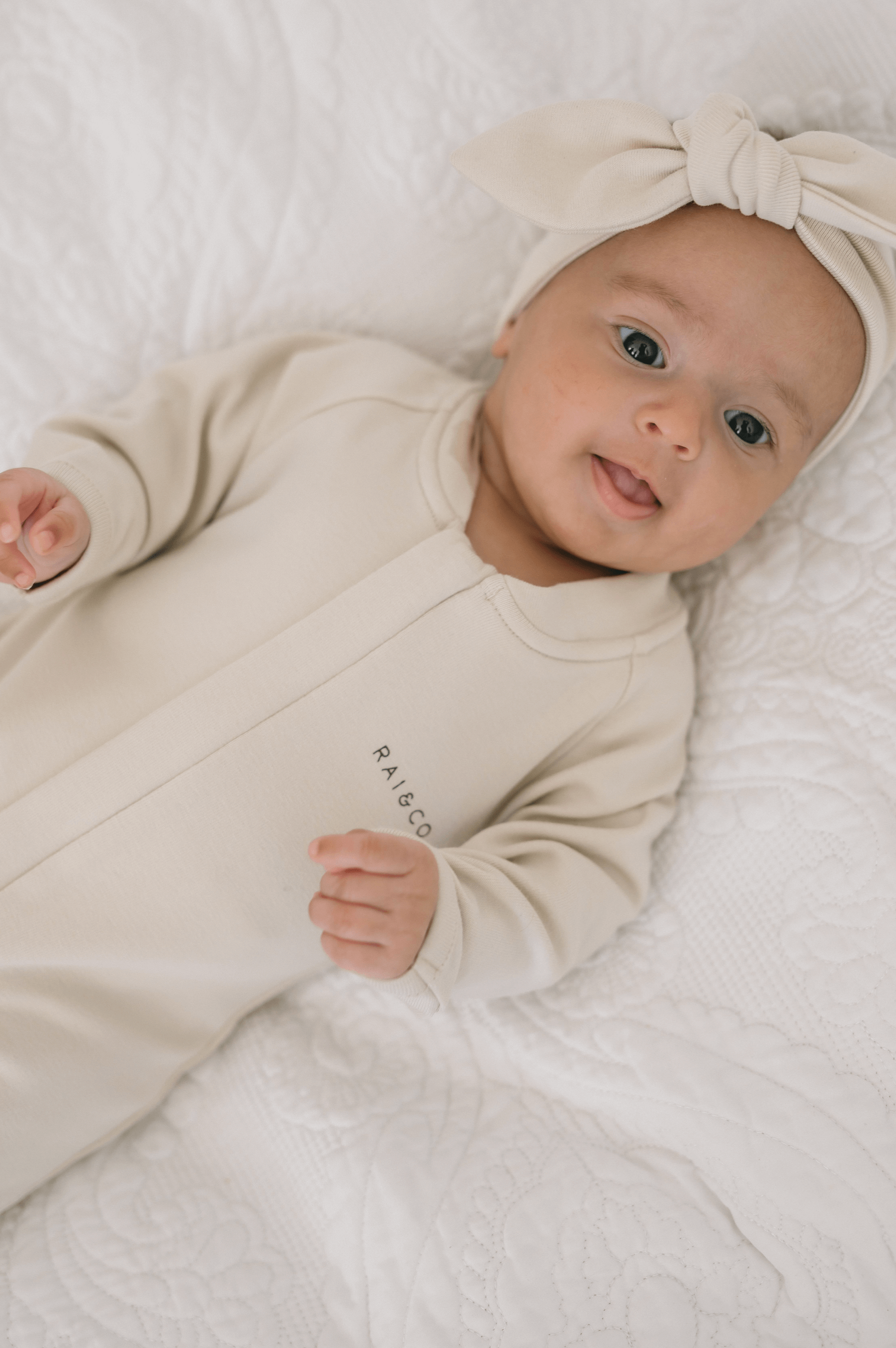 Welcoming our new little addition to the RAI&CO family are the knotted headbands. Who doesn't love an oversized bow headband on a little baby. Made from matching material to our Apple jumpsuits. Super stretchy and soft. HOW TO TIE The easiest way for us is to place the headband around your leg. Cross both sides over to form a tie (like a shoe lace). Then repeat same action to form a knot.