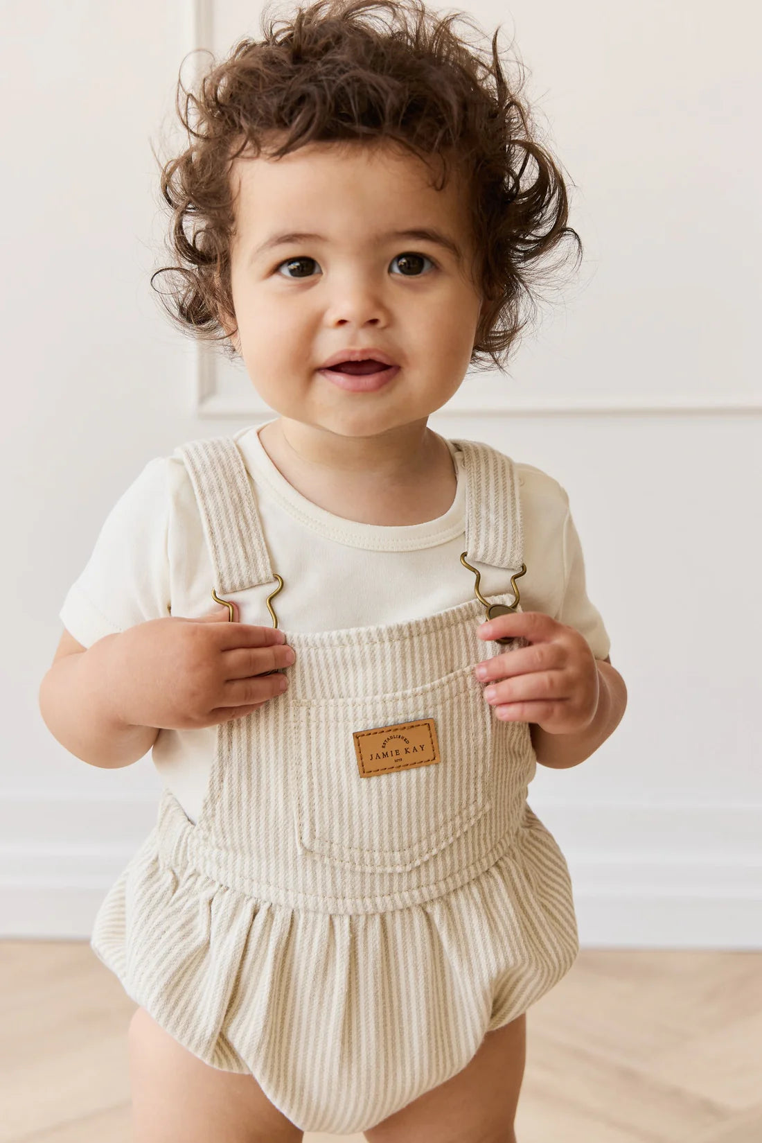 The Pax Playsuit – Fine Vertical Stripe Sandy Brown/Cloud is a timeless piece designed for comfort and style. Featuring soft vertical stripes in sandy brown and cloud tones, this playsuit includes adjustable suspender-style straps with metal buckles, an elasticated waist and leg openings, and a sweet chest patch detail for added charm.