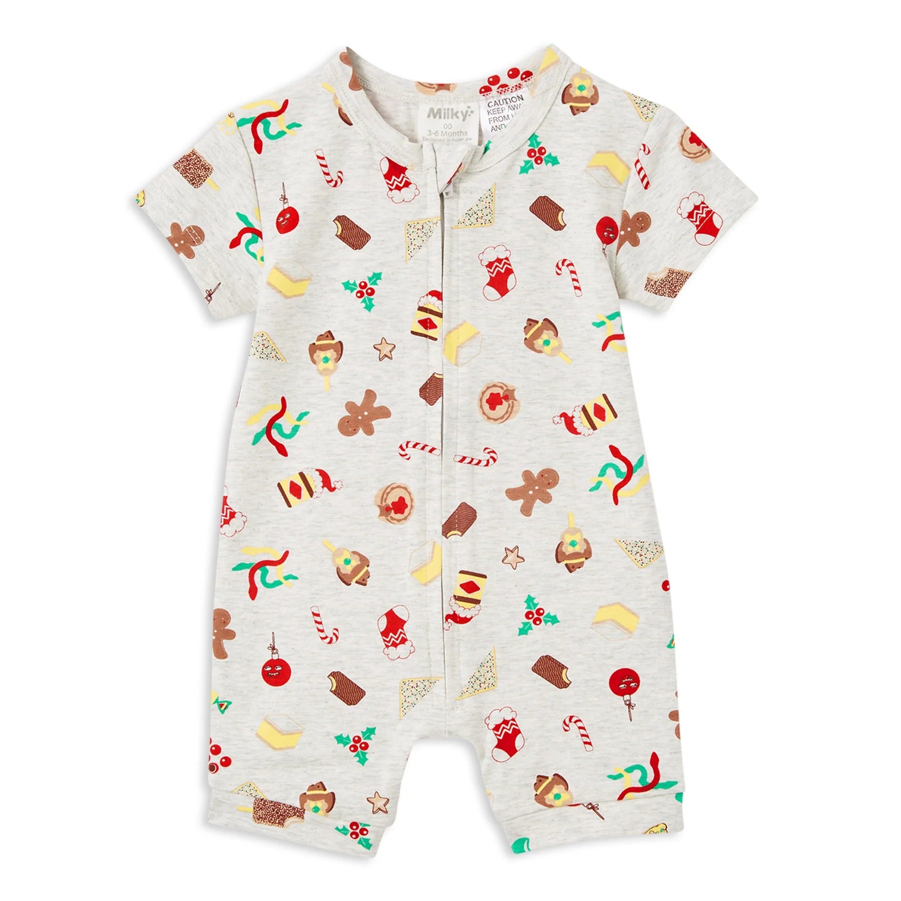 Milky Clothing Summer Christmas Zip Romper. Introducing our adorable festive romper, expertly crafted to offer your little one the ultimate trifecta of comfort, style, and practicality. Designed with care and attention to detail, this romper ensures your baby stays cozy and fashionable throughout the day. With its silver marle base and delightful all-over Christmas themed print, it injects a festive flair into your baby's wardrobe. Plus, the thoughtful addition of a convenient center front 2-way zip simplifies dressing and nappy changes, making your life a breeze.