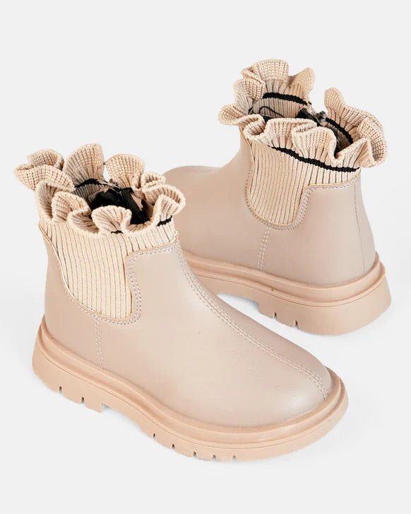 In a go-with-everything Neutral, the new Flora Boot is stylish and practical! This zip-on boot with a knitted frill sock detail makes for the cutest all season shoe - no doubt your little one will get lots of wear out of this one!