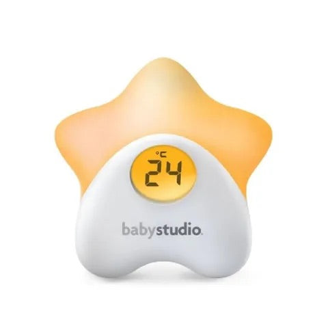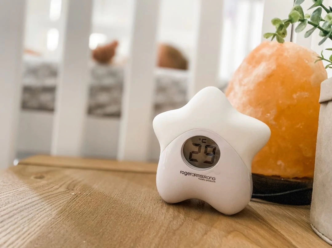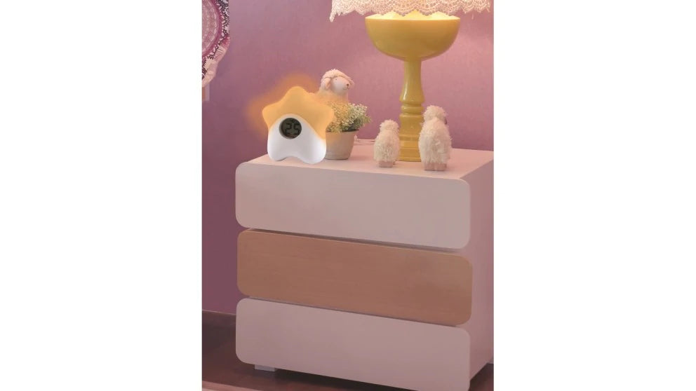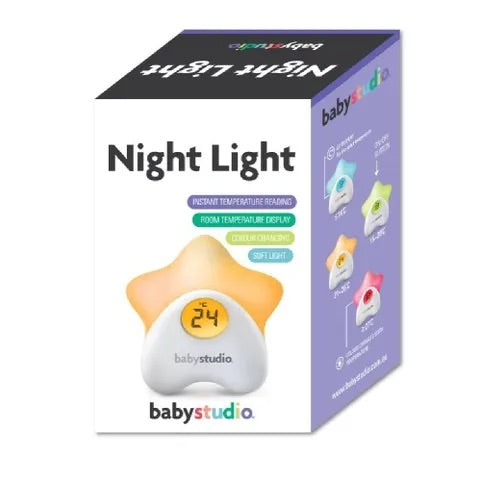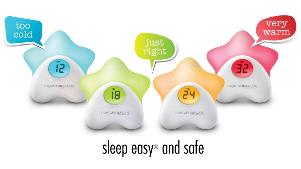 Provide a soft night light while keeping track of the temperature in bub's nursery with the Star Colour Changing Thermometer Night Light from Roger Armstrong.