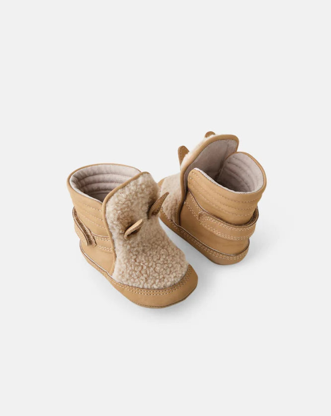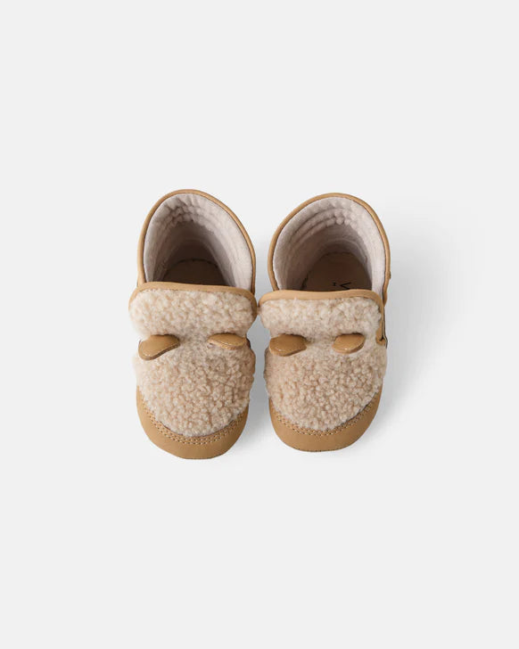 The Bessie bootie, are soft both inside and out, featuring a faux shearling lining and a Velcro adjustable strap closure designed for comfort and ease. The Bessie bootie also includes a soft, unstructured sole, perfect for little feet.