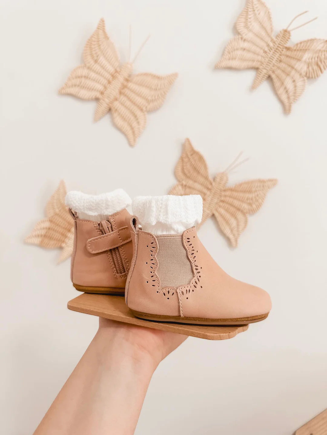 Our new release Parker riding boots are made from the softest wax leather and have the cutest subtle pattern detail on the side. They are light weight and have a zip on the side to make them easy to get on and off those little wriggly feet.