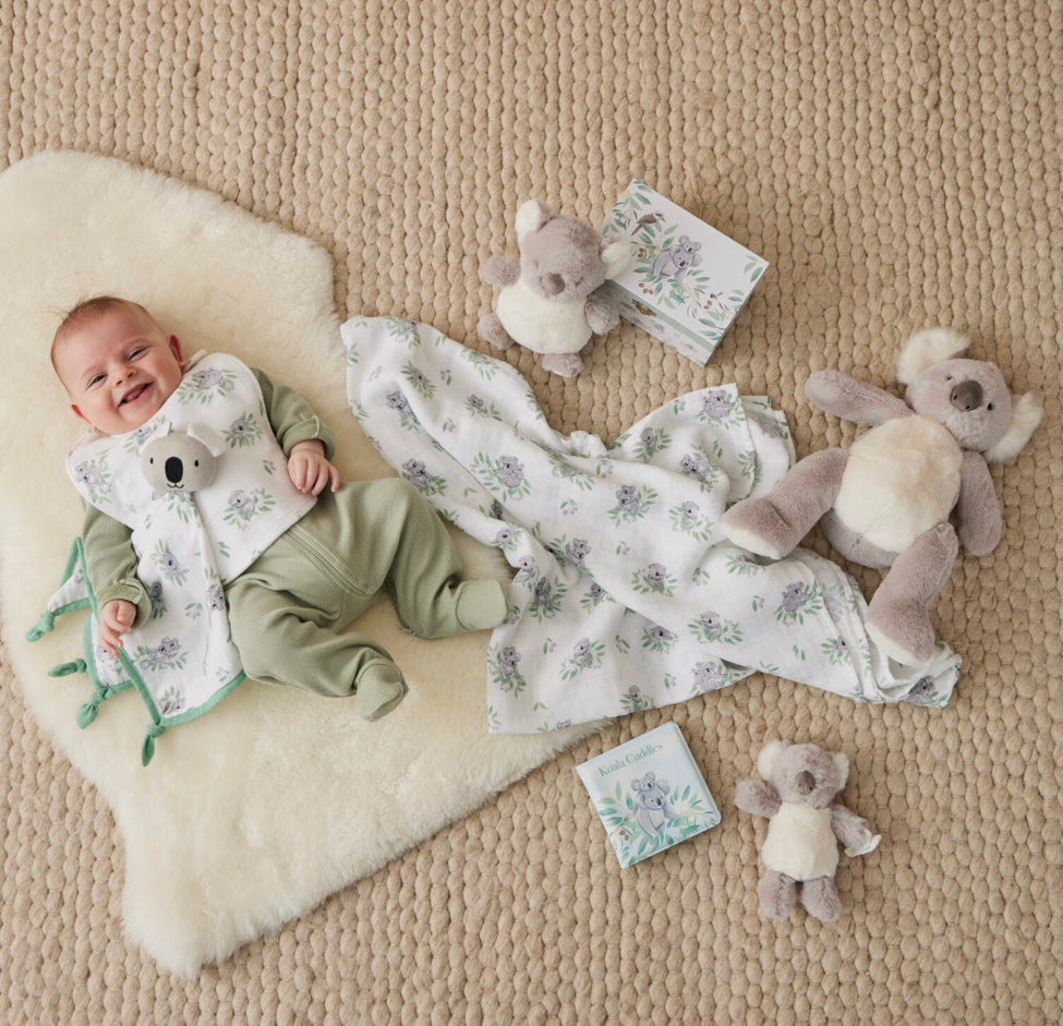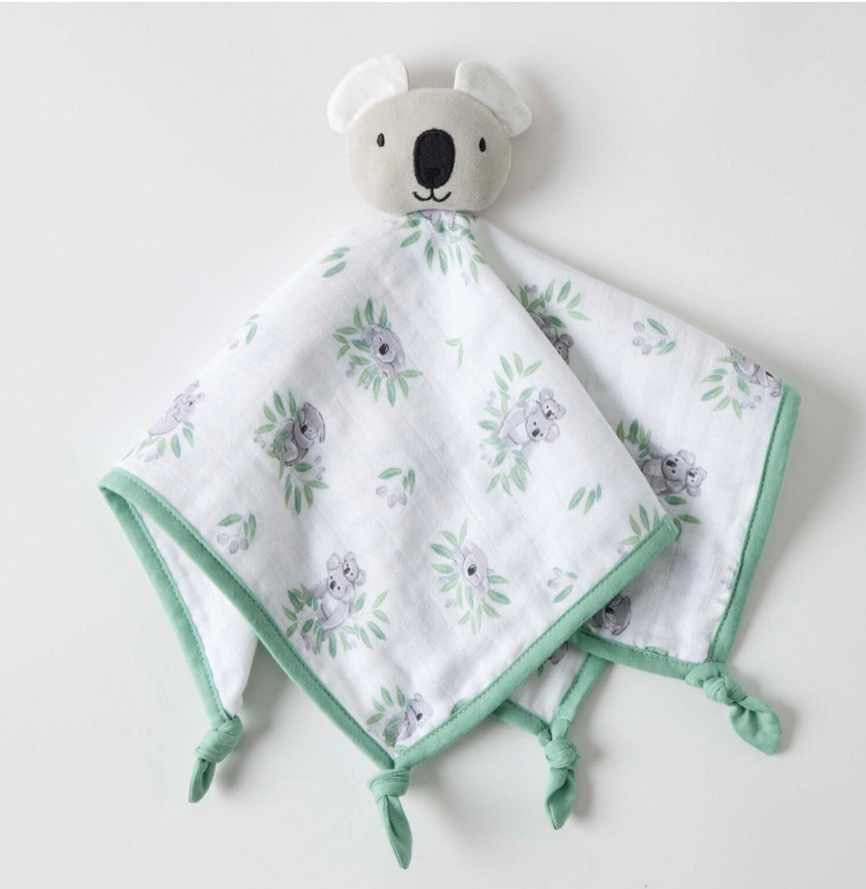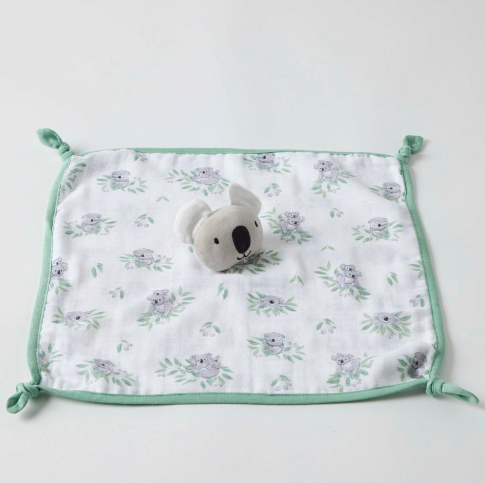Perfect for little hands to explore, the Koala Cuddles Muslin Comforter is cute, soft and safe for a baby or toddler. This comforter features adorable, cuddly Koalas and decorative motifs, all which help stimulate baby’s senses while providing comfort.