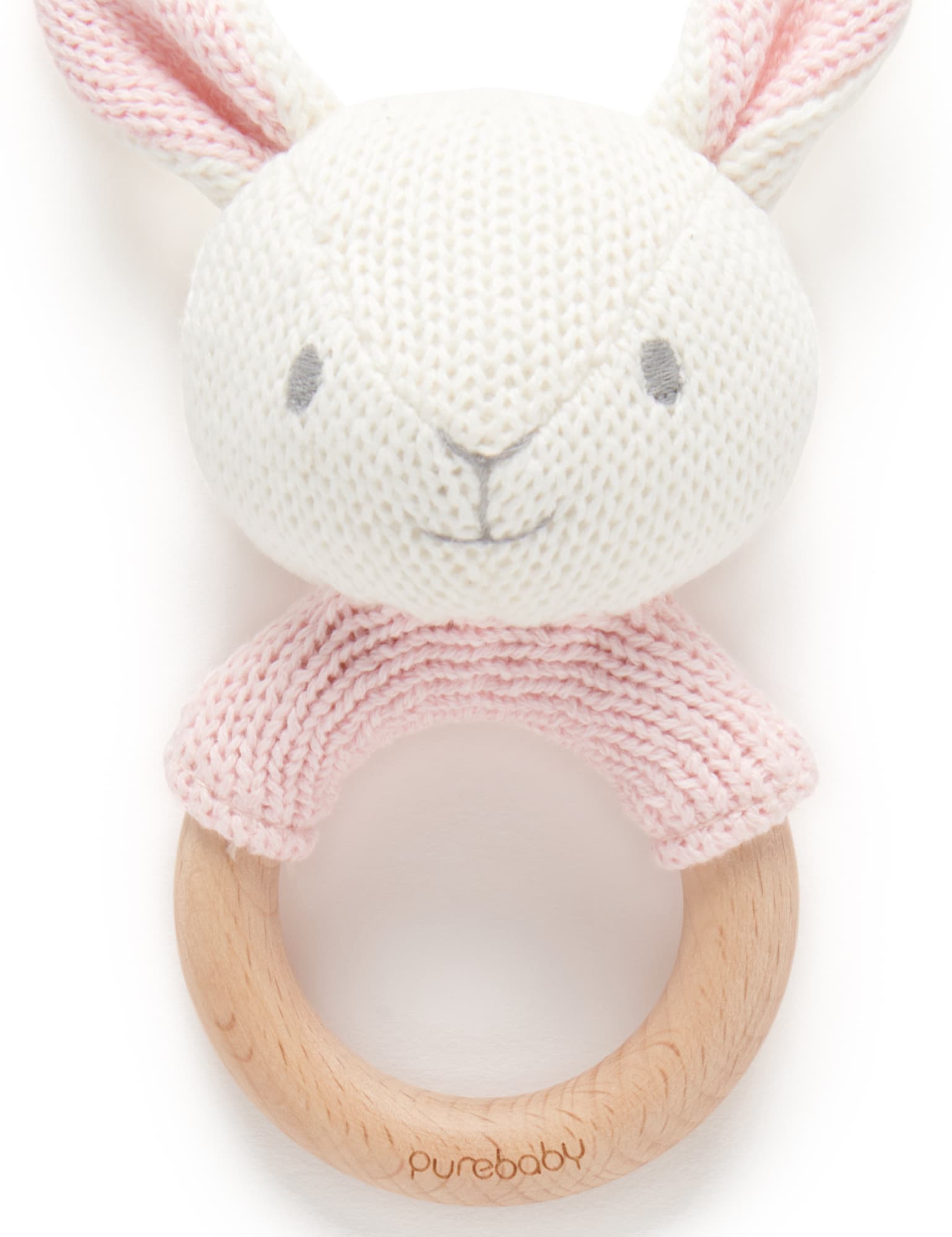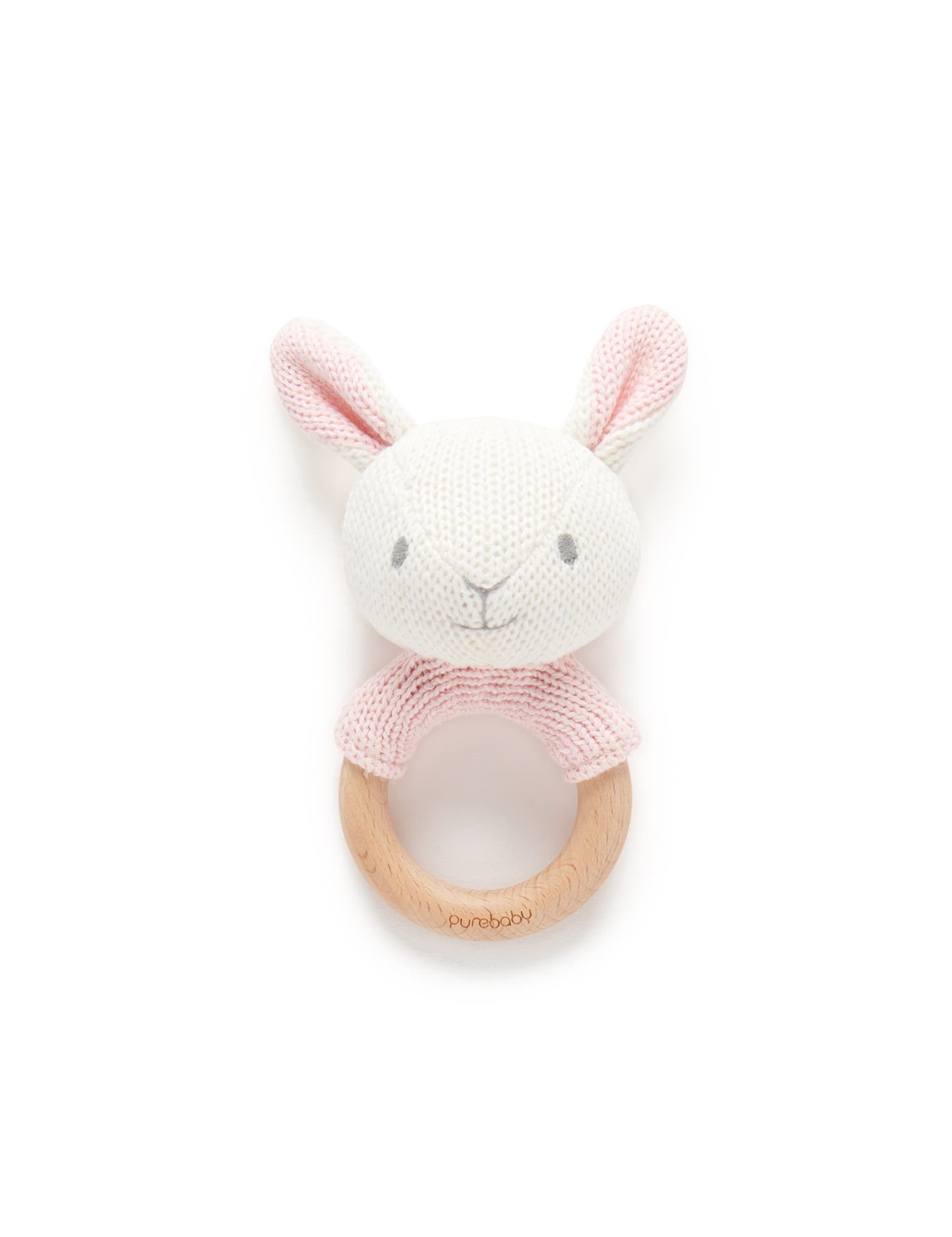 Our Rabbit Rattle is engaging and sweet for those little hands to grab a hold of and wrap their fingers around. Featuring a knitted rabbit with rattle included and set on a beech wood ring.