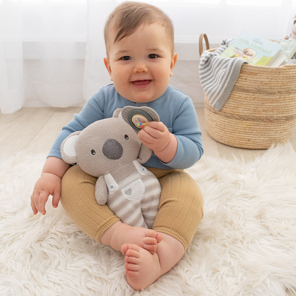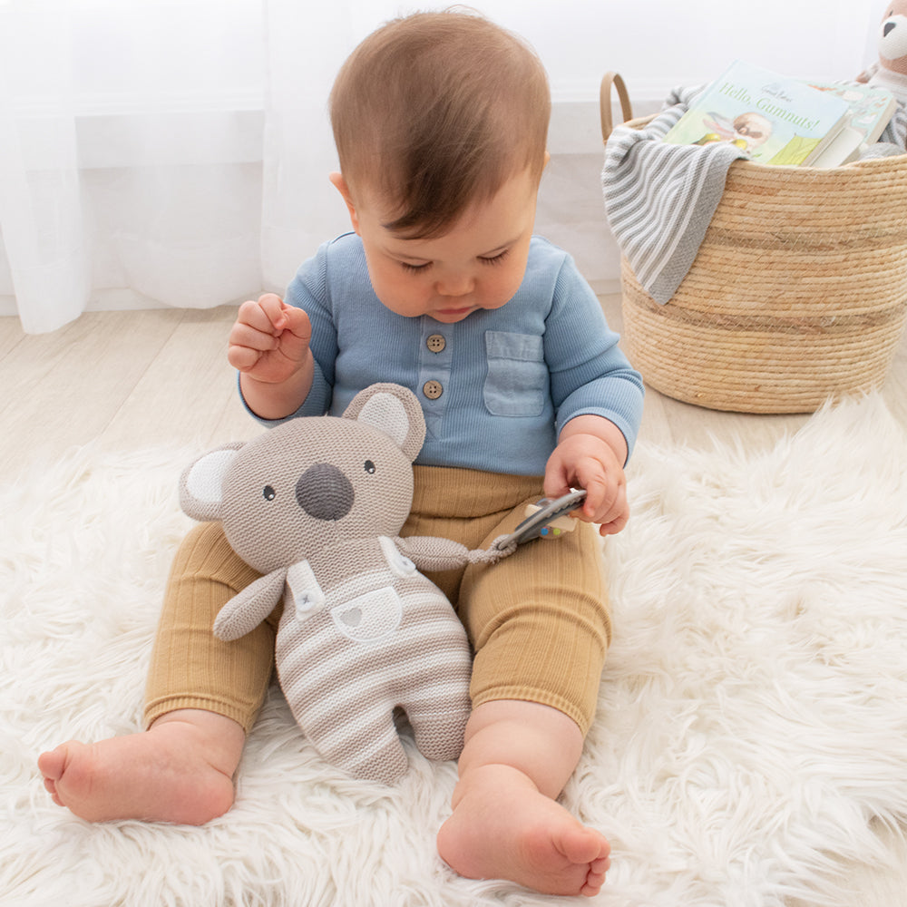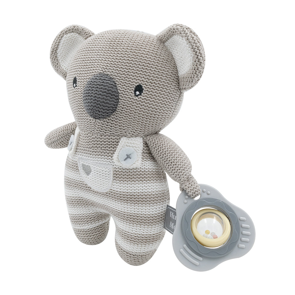 The perfect companion for on the go cuddles and fun. Made from 100% cotton knit and featuring a fun spinning rattle baby will love to pay with, this cute Koala will provide lots of entertainment for bub at home or on the go!