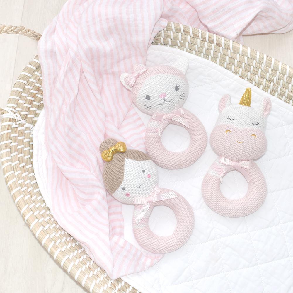 Keep baby entertained with our gorgeous Kenzie the Unicorn ring rattle. Made from 100% cotton knit and featuring a soft jingling rattle, Kenzie is sure to be instantly loved by baby. Match back with our Kenzie the Unicorn Knitted toy or security blanket for the perfect gift.
