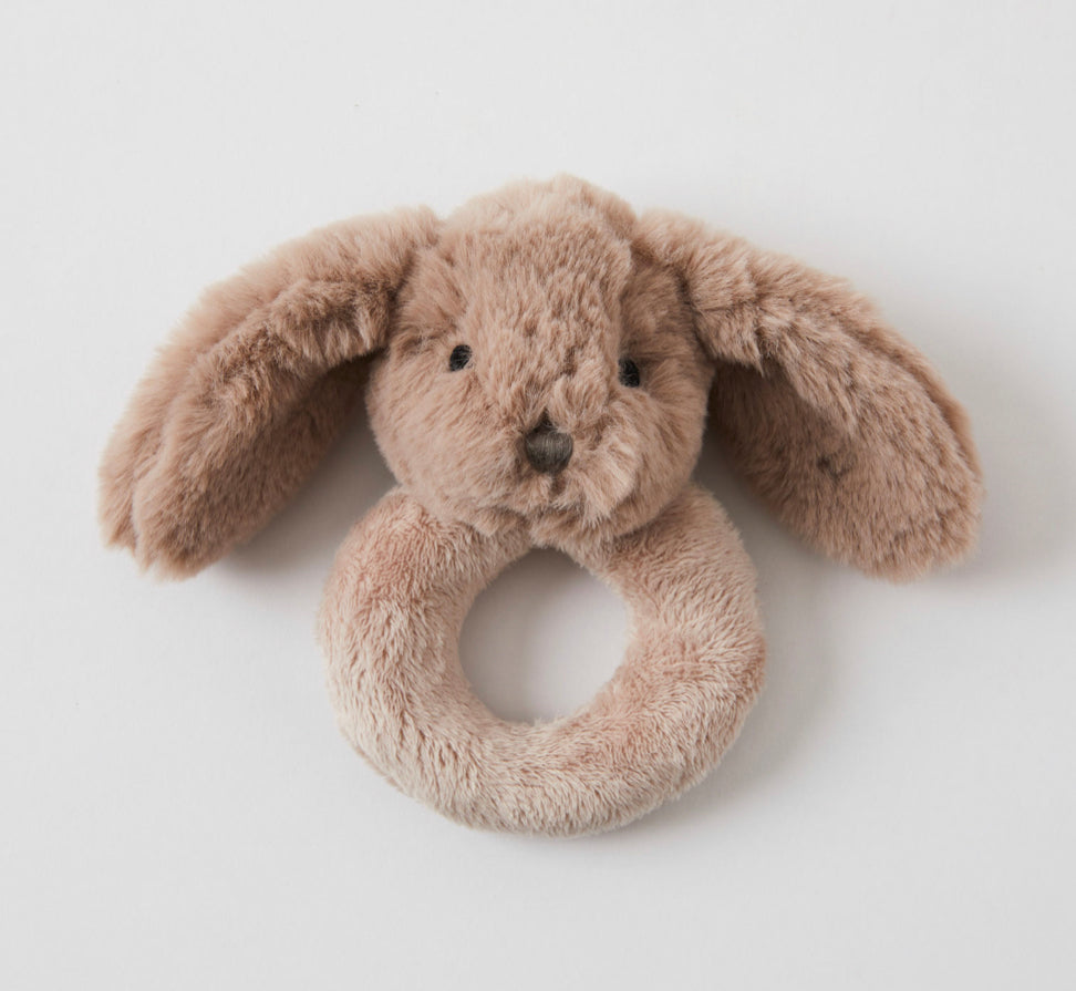 The Taupe Bunny  Rattle will keep any baby delighted. This ultra-soft and easy-to-grab hand rattle is designed to soothe little ones while gently encouraging the development of their senses – touch, hearing and sight.