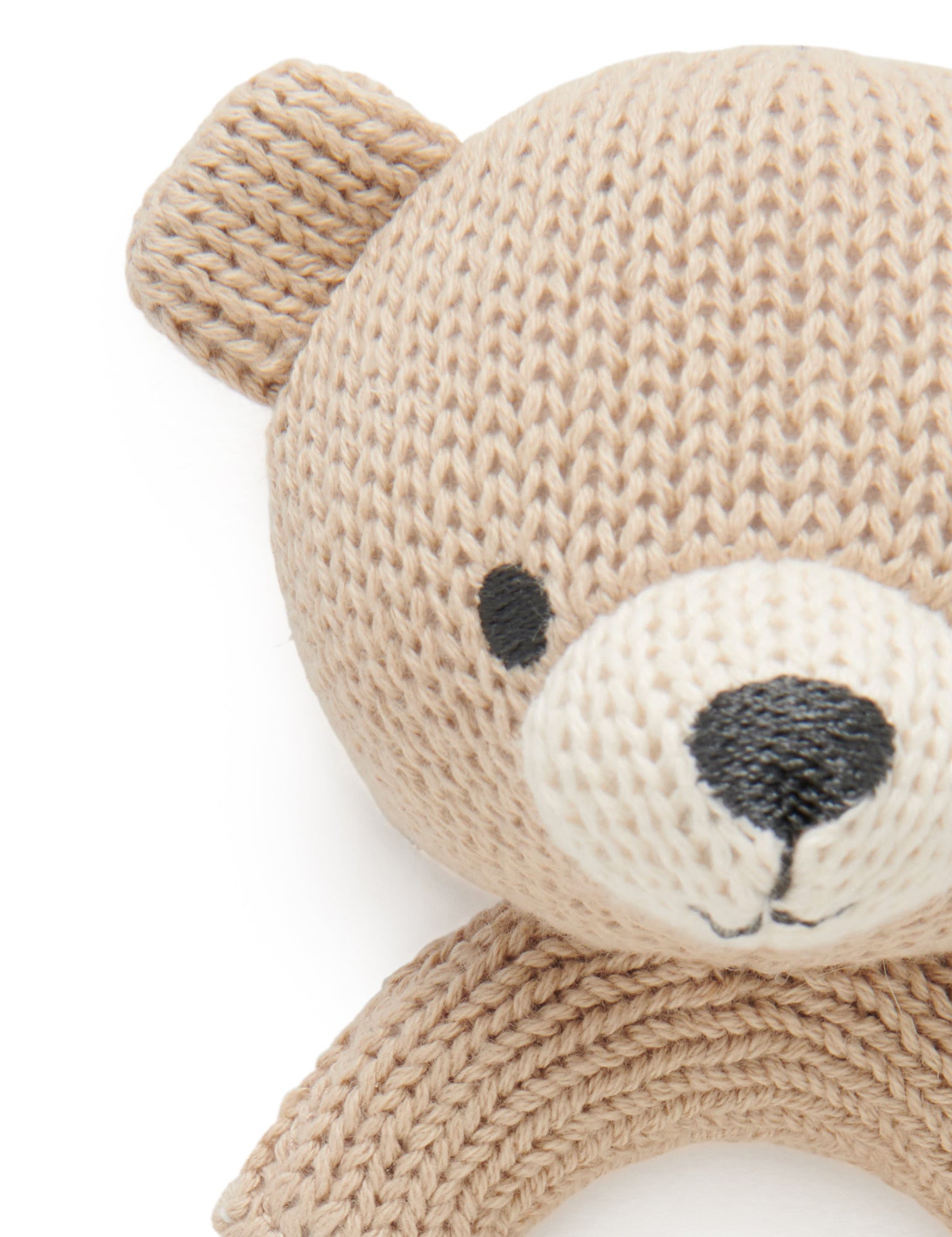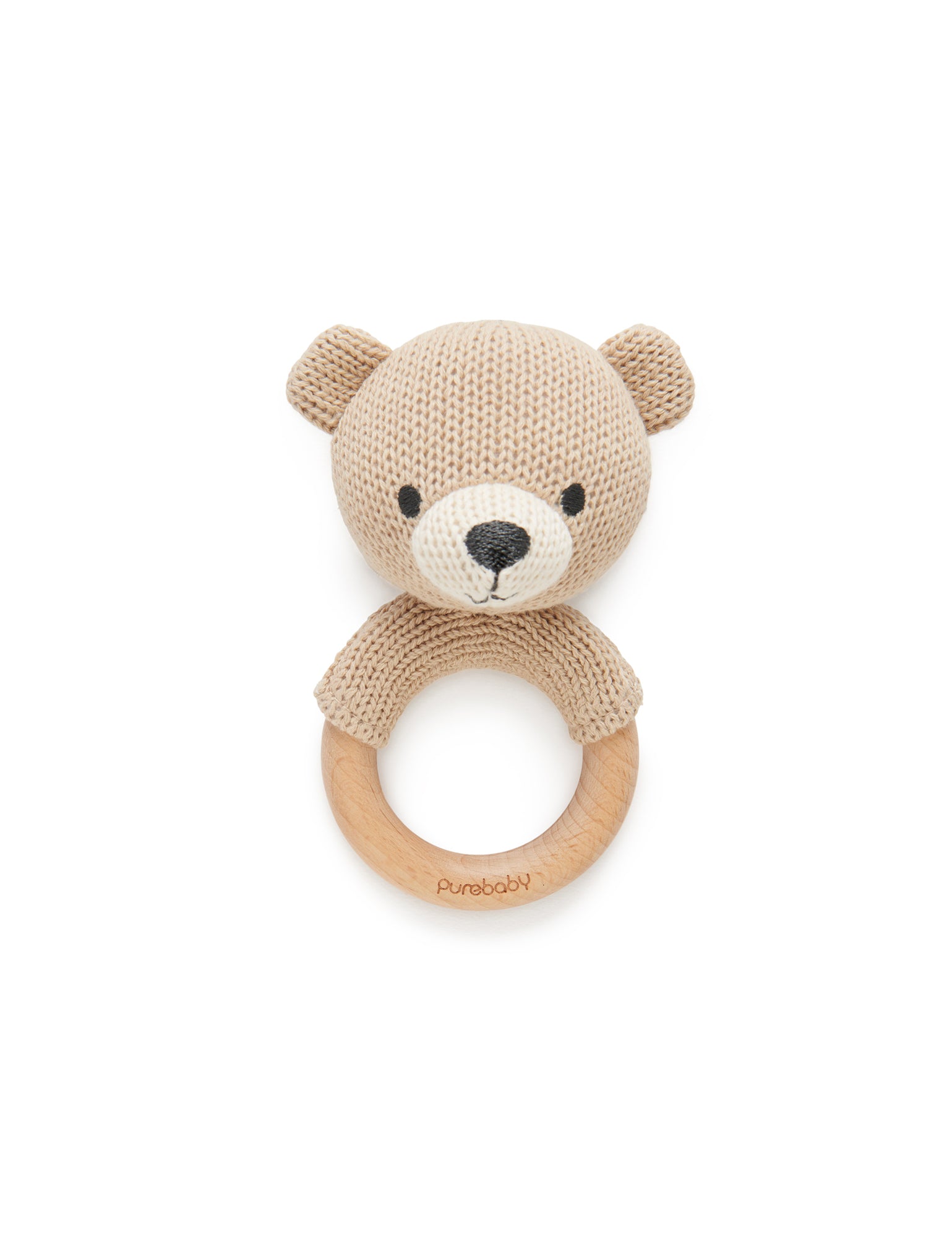 - Featuring a knitted bear with rattle included and set on a beech wood ring.