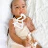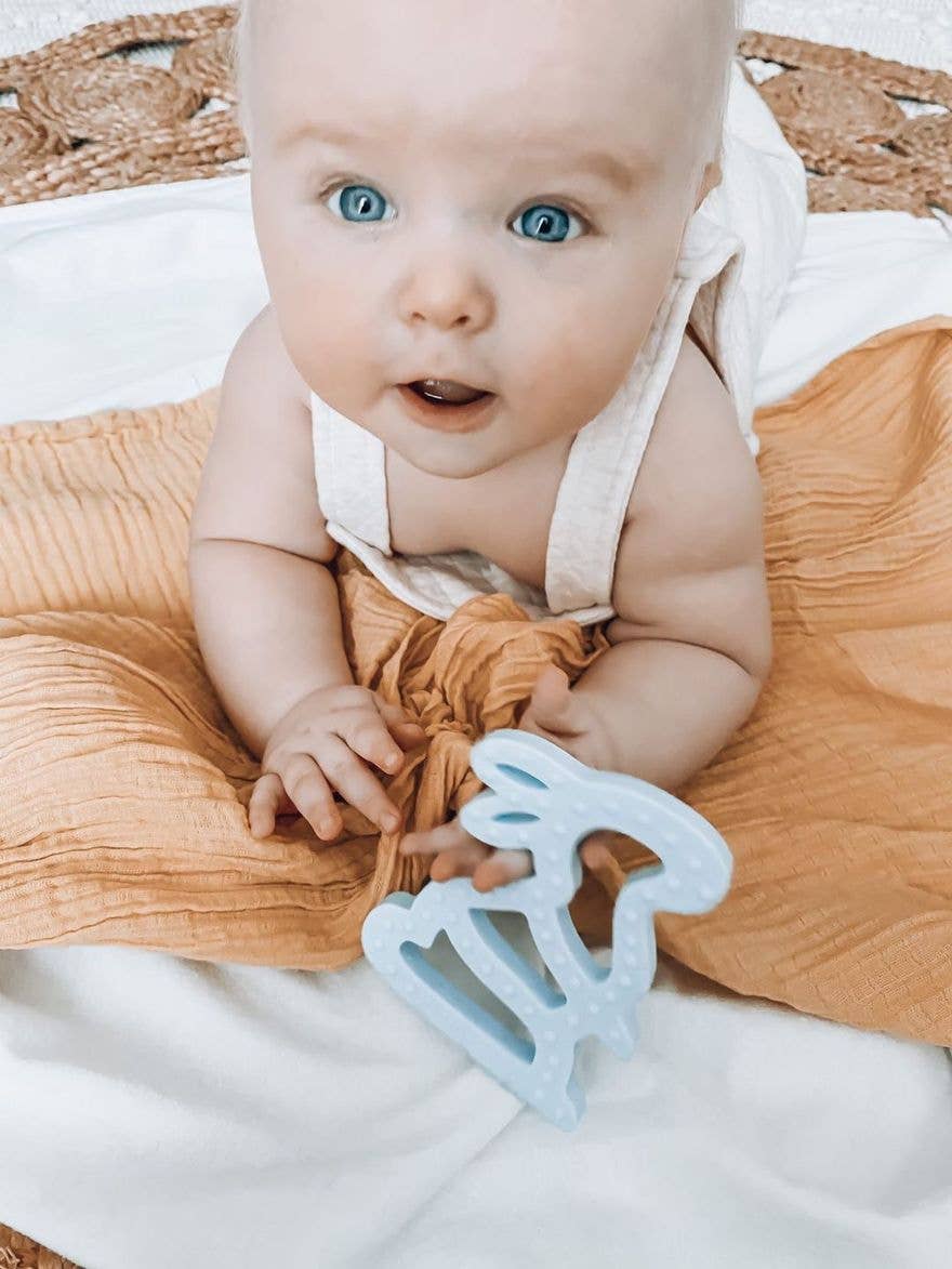 Our silicone bunny teether is a MUST HAVE for your teething babe. Our bunny is easy to hold and designed with little hands in mind, it will not only soothe sore and tender gums, but it will also help babies with different tactile sensations as they bend, twist, chew, and play!