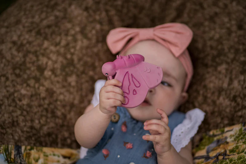 An adorable all rubber teether that is great for little hands to grab and squeeze.