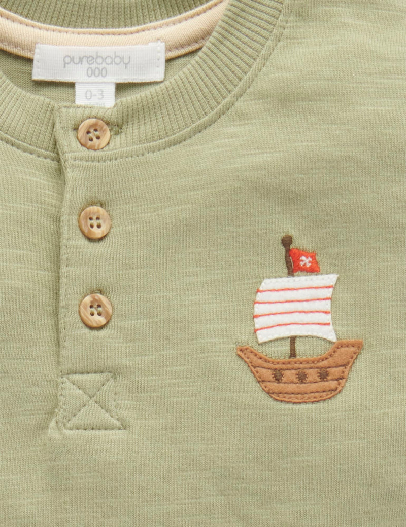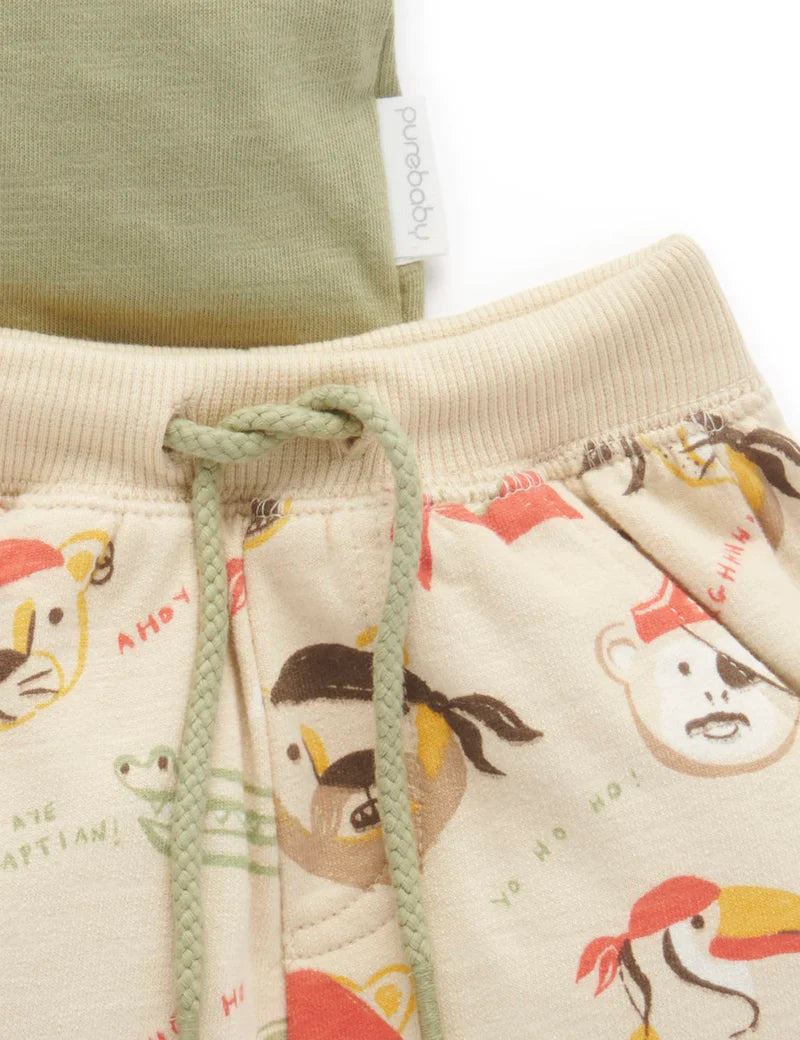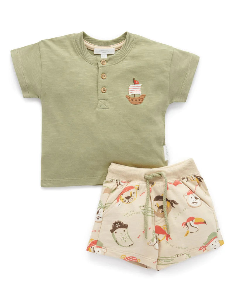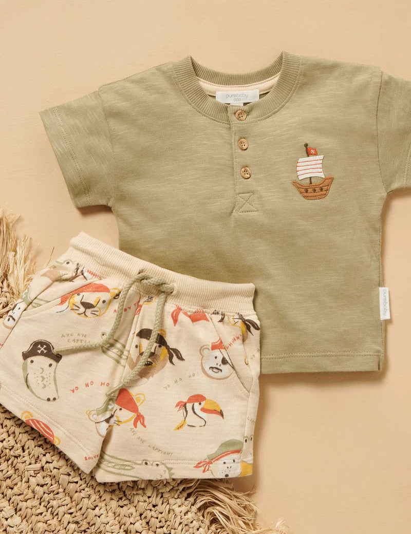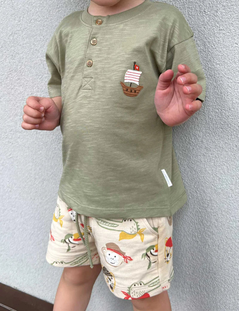 Our Aye Aye Set takes the fuss out of dressing with the perfect matching pieces! Featuring a classic henley tee made from soft jersey with a subtle slub, and comfortable shorts made from stretchy unbrushed fleece with a pirate animal print. Made from our GOTS certified 100% Organic Cotton for a soft and breathable outfit, perfect for those warm sunny days.
