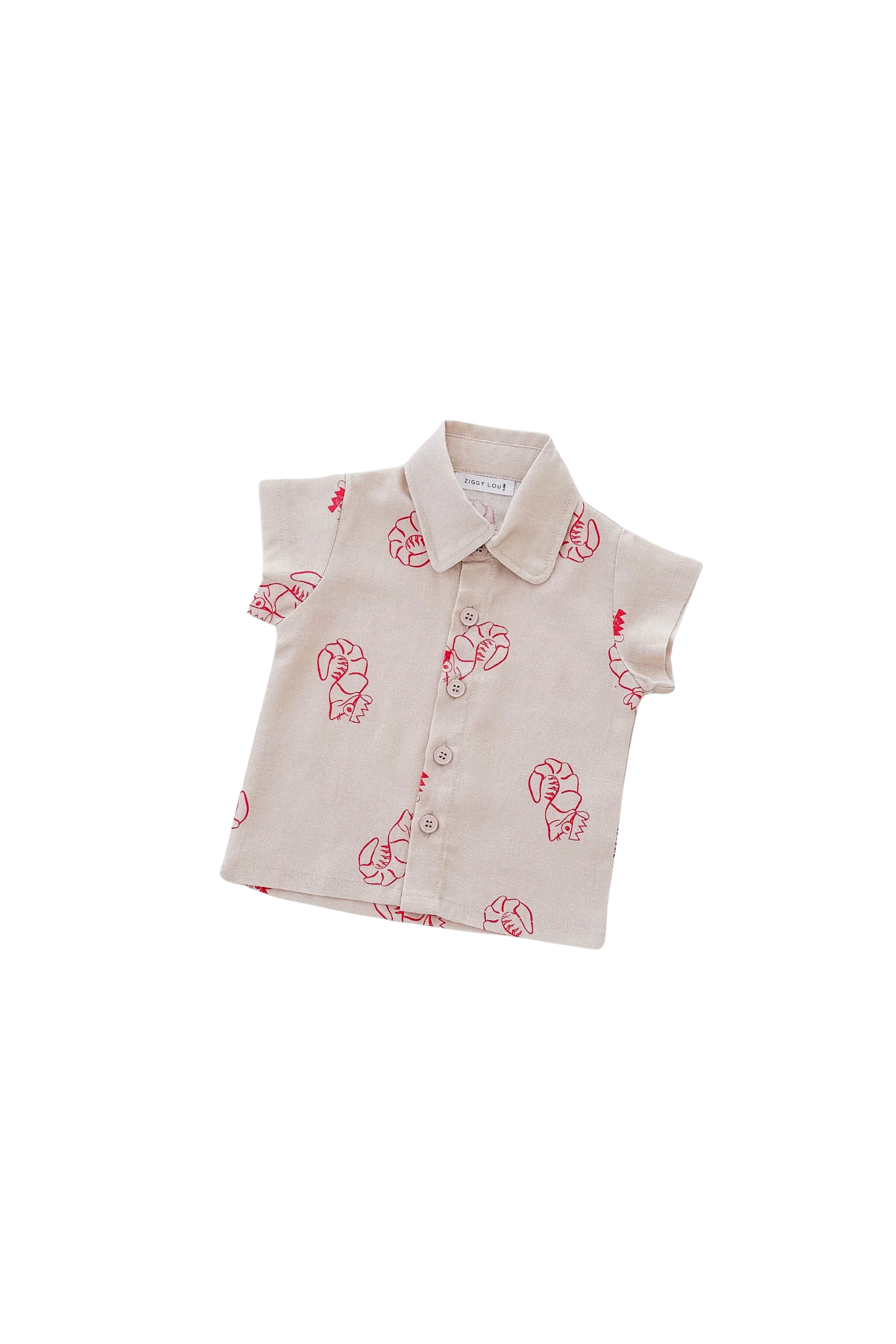 Linen blend shirt featuring our Shawn the Prawn design. Functional buttons down the front. Matching shirt also available in mens.